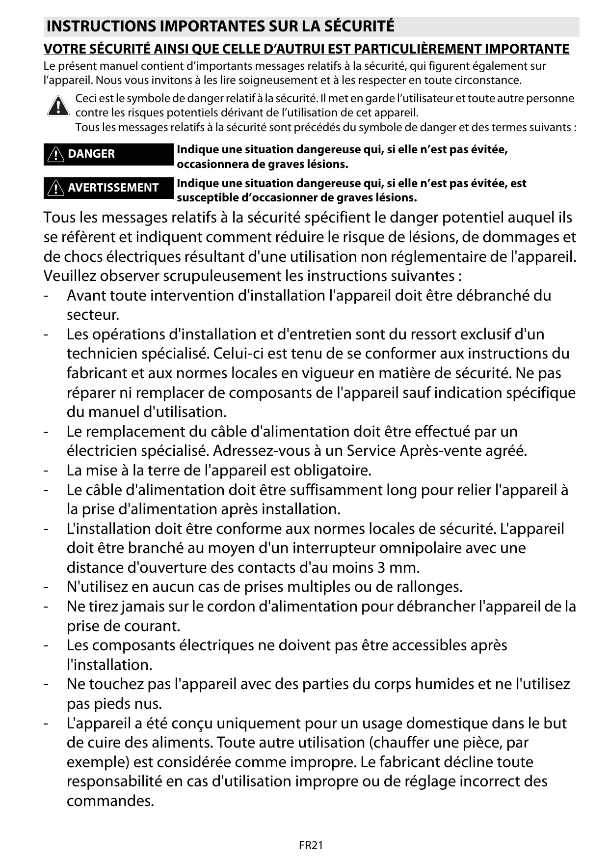 Tous les messages relatifs à la sécurité spécifient le danger potentiel auquel ils se réfèrent et indiquent comment réduire le risque de lésions, de dommages et de chocs électriques résultant d'une utilisation non réglementaire de l'appareil. Veuillez observer scrupuleusement les instructions suivantes : - Avant toute intervention d'installation l'appareil doit être débranché du secteur. - Les opérations d'installation et d'entretien sont du ressort exclusif d'un technicien spécialisé. Celui-ci est tenu de se conformer aux instructions du fabricant et aux normes locales en vigueur en matière de sécurité. Ne pas réparer ni remplacer de composants de l'appareil sauf indication spécifique du manuel d'utilisation. - Le remplacement du câble d'alimentation doit être effectué par un électricien spécialisé. Adressez-vous à un Service Après-vente agréé. - La mise à la terre de l'appareil est obligatoire. - Le câble d'alimentation doit être suffisamment long pour relier l'appareil à la prise d'alimentation après installation. - L'installation doit être conforme aux normes locales de sécurité. L'appareil doit être branché au moyen d'un interrupteur omnipolaire avec une distance d'ouverture des contacts d'au moins 3 mm. - N'utilisez en aucun cas de prises multiples ou de rallonges. - Ne tirez jamais sur le cordon d'alimentation pour débrancher l'appareil de la prise de courant. - Les composants électriques ne doivent pas être accessibles après l'installation. - Ne touchez pas l'appareil avec des parties du corps humides et ne l'utilisez pas pieds nus. - L'appareil a été conçu uniquement pour un usage domestique dans le but de cuire des aliments. Toute autre utilisation (chauffer une pièce, par exemple) est considérée comme impropre. Le fabricant décline toute responsabilité en cas d'utilisation impropre ou de réglage incorrect des commandes. FR21