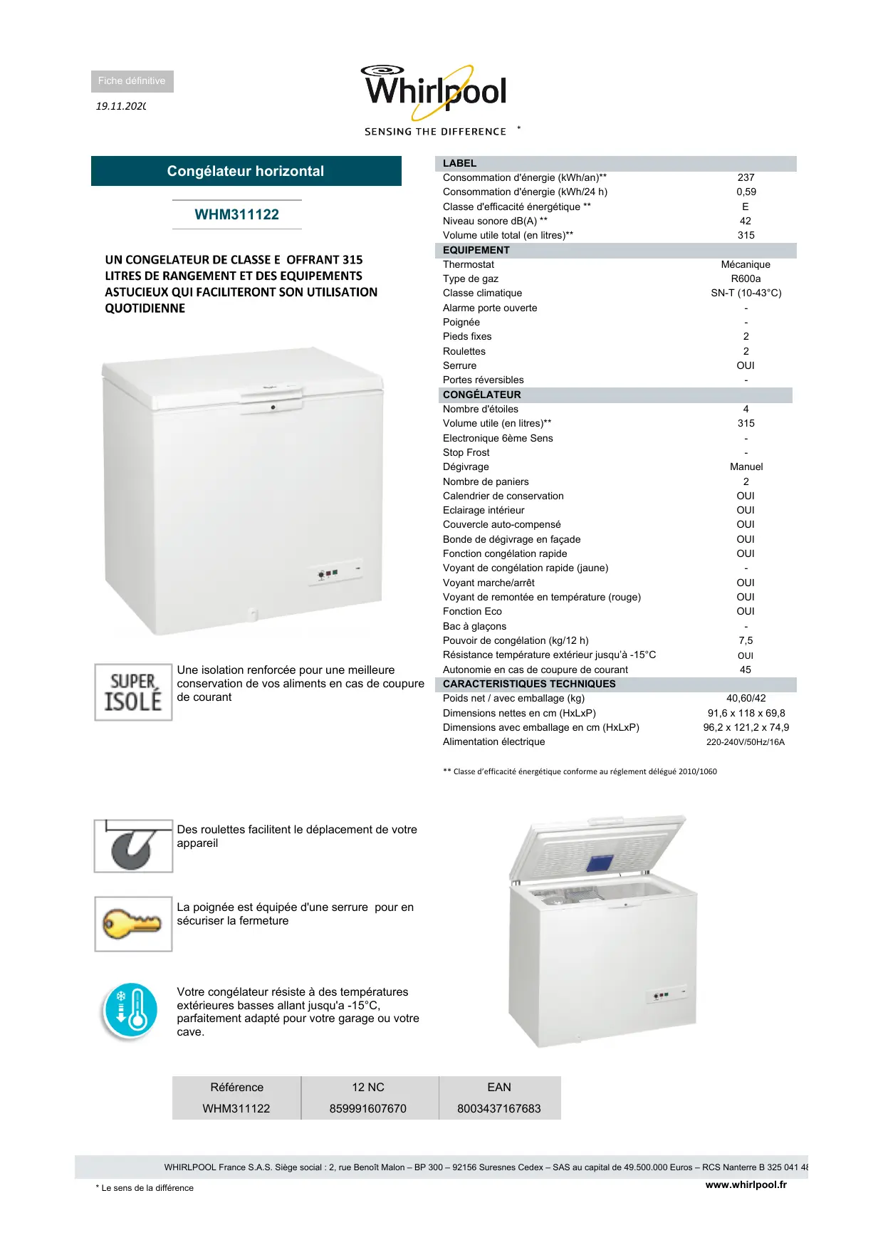 WHM 31 1122 - Congélateur horizontal WHIRLPOOL - Notice d'utilisation et mode d'emploi gratuit