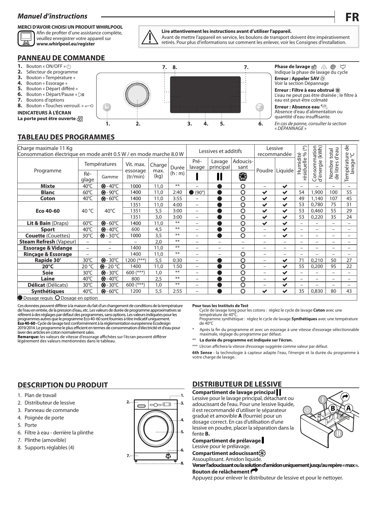 WHIRLPOOL - Lave-linge hublot WHIRLPOOL - Notice d'utilisation et mode d'emploi gratuit