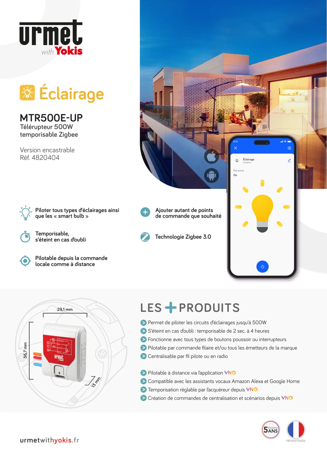 | Fonctions principales | Temporisation réglable, contrôle d'éclairage à distance |