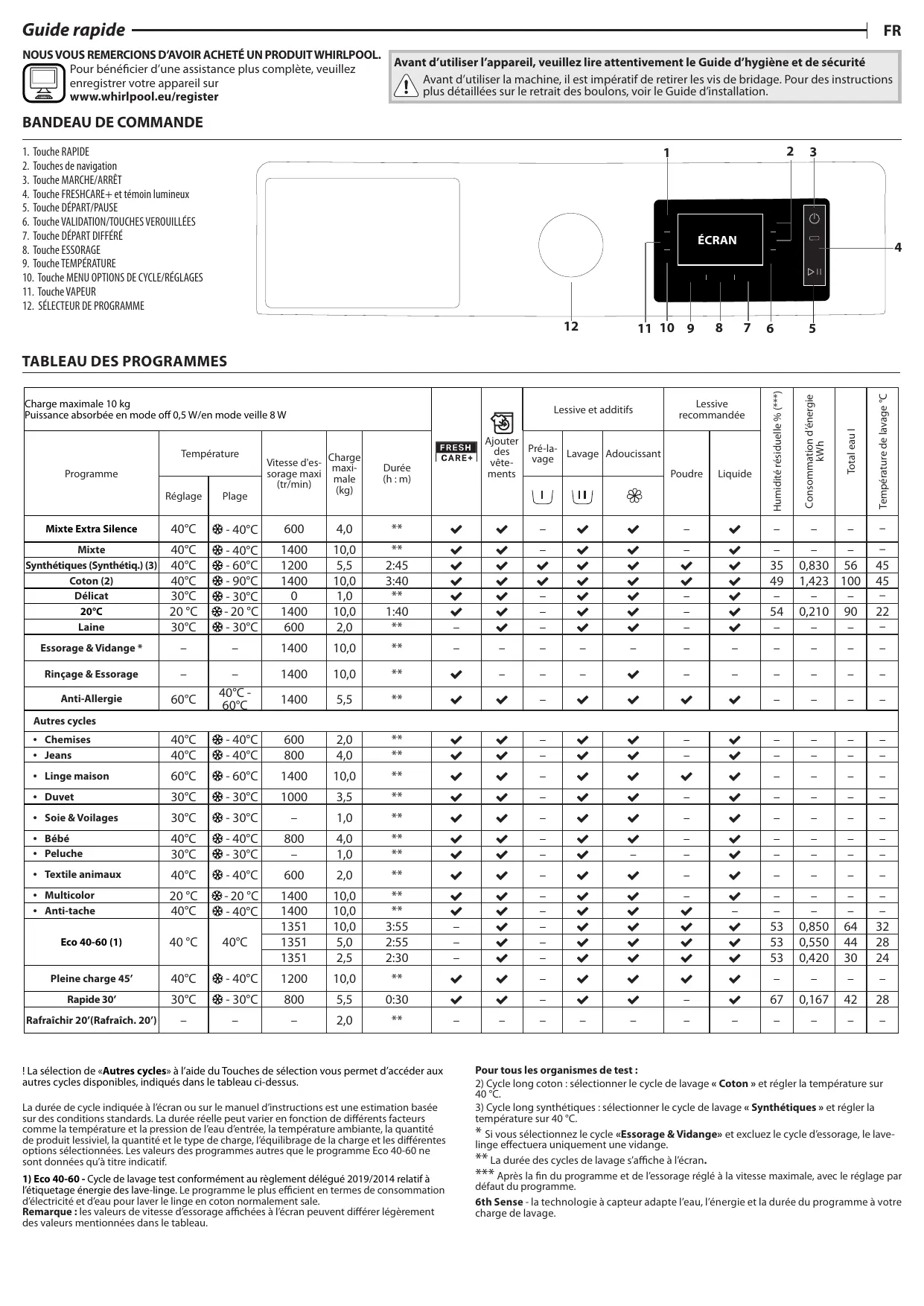 | Nombre de programmes de lavage | 14 programmes |