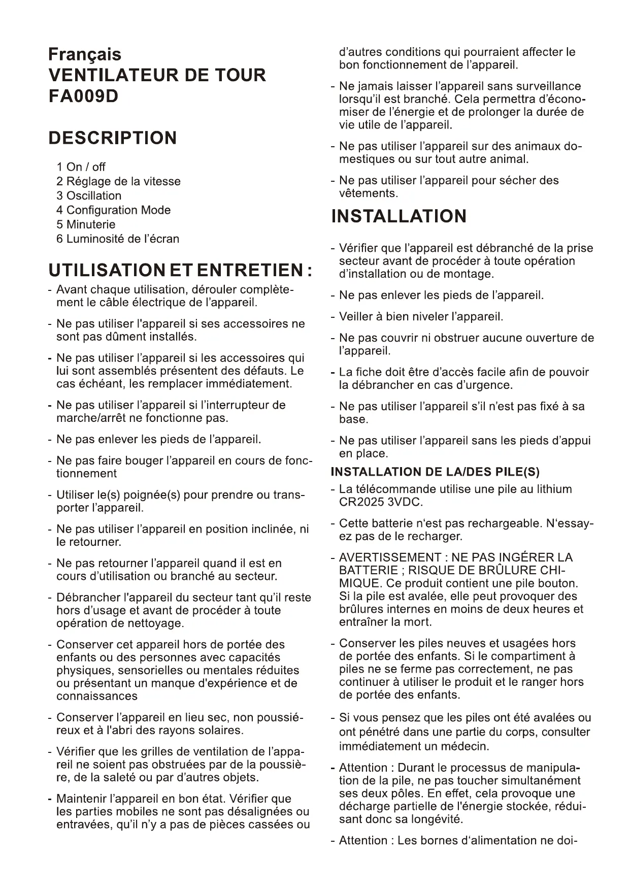 | Caractéristiques techniques principales | Ventilateur à colonne avec plusieurs vitesses |