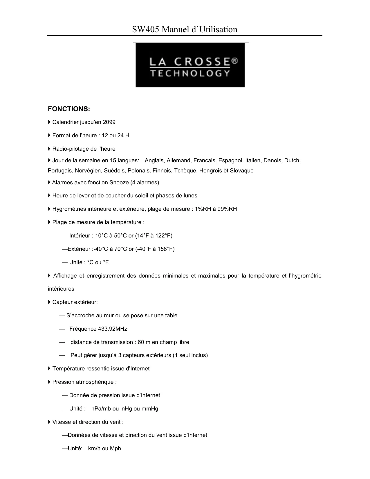 Retrouvez gratuitement la notice de l'appareil SW405BLA LA CROSSE TECHNOLOGY au format PDF.