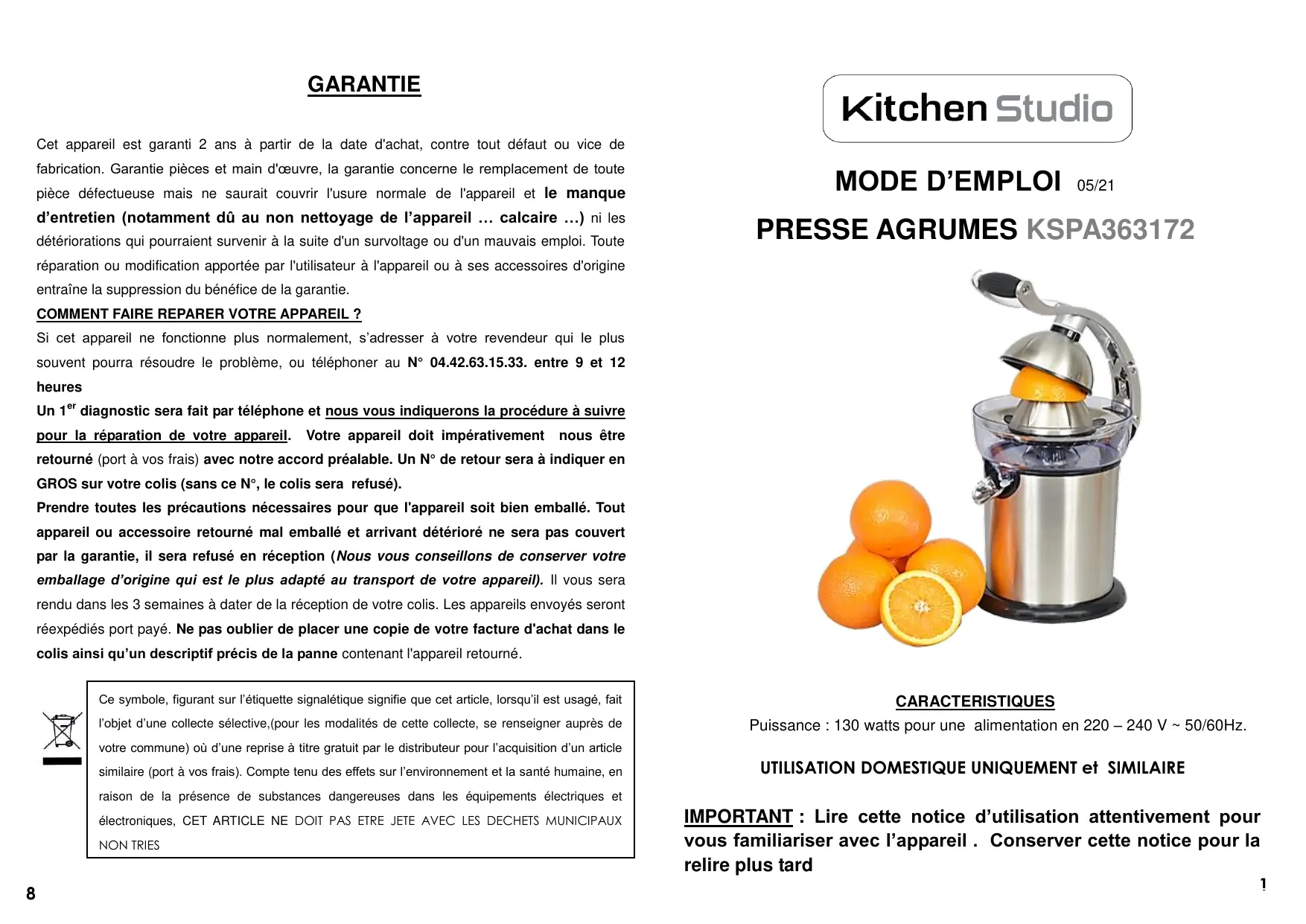 KSPA363172 - Presse-agrumes KITCHEN CHEF - Notice d'utilisation et mode d'emploi gratuit