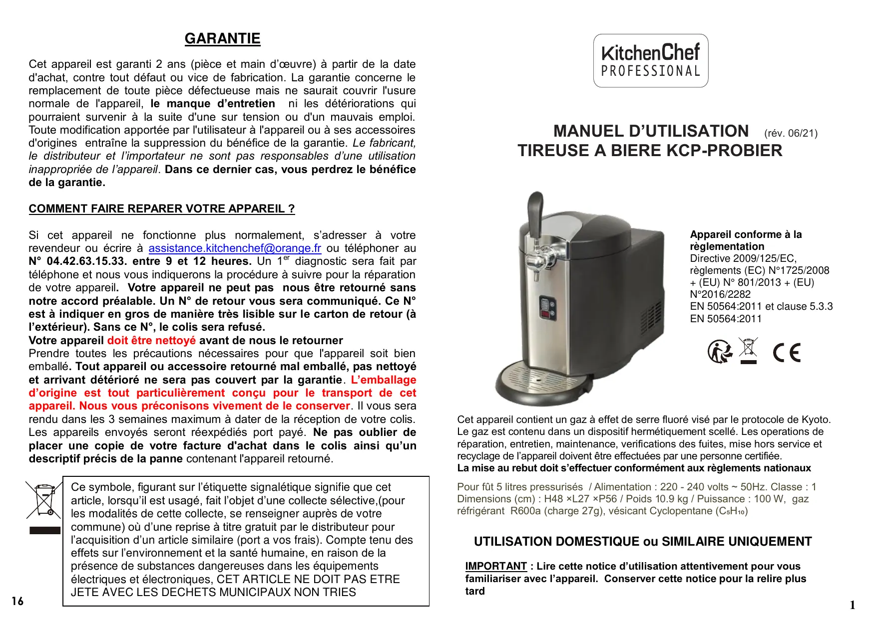 Téléchargez la notice de votre Tireuse à bière au format PDF gratuitement ! Retrouvez votre notice KCPPROBIER - KITCHEN CHEF et reprennez votre appareil électronique en main. Sur cette page sont publiés tous les documents nécessaires à l'utilisation de votre appareil KCPPROBIER de la marque KITCHEN CHEF.