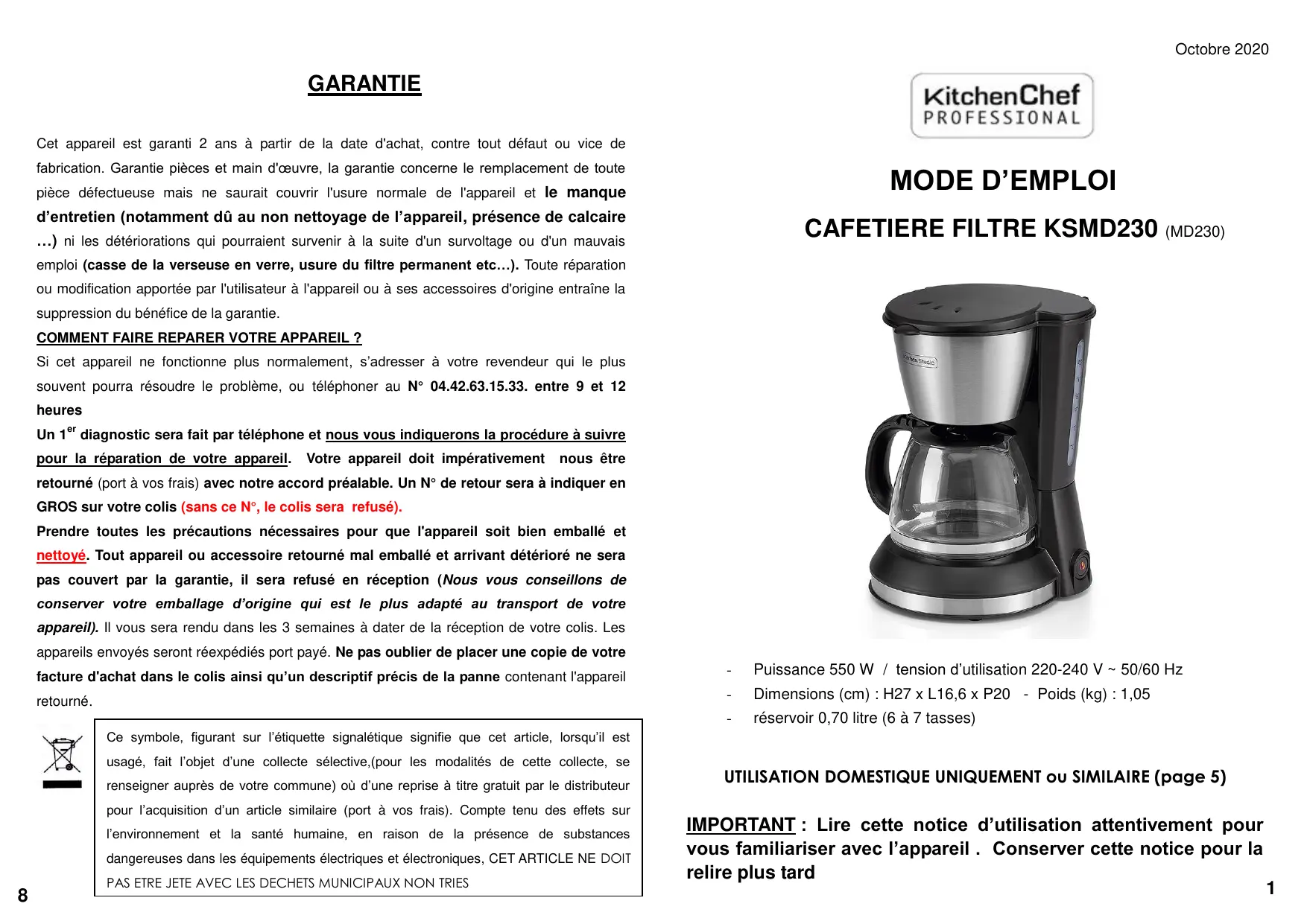 KSMD230 - Cafetière à filtre KITCHEN CHEF - Notice d'utilisation et mode d'emploi gratuit