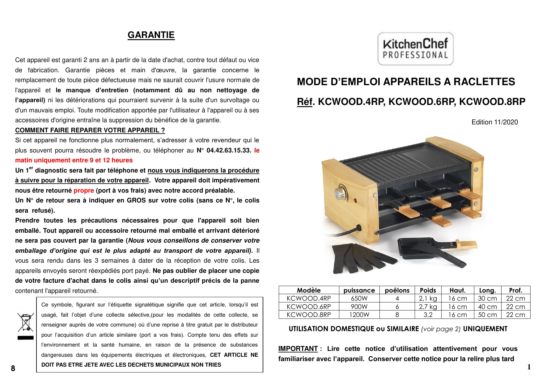KCWOOD4RP - Appareils à raclette KitchenChef - Notice d'utilisation et mode d'emploi gratuit
