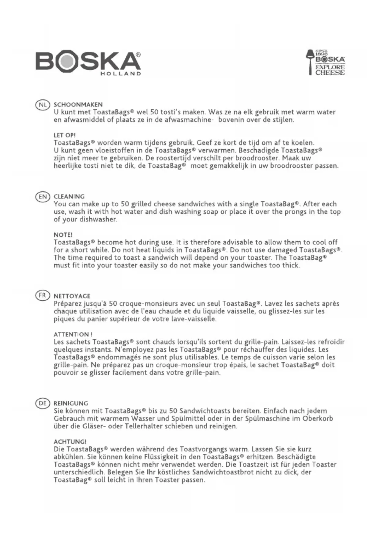 Retrouvez gratuitement la notice de l'appareil Toastabags Boska au format PDF.