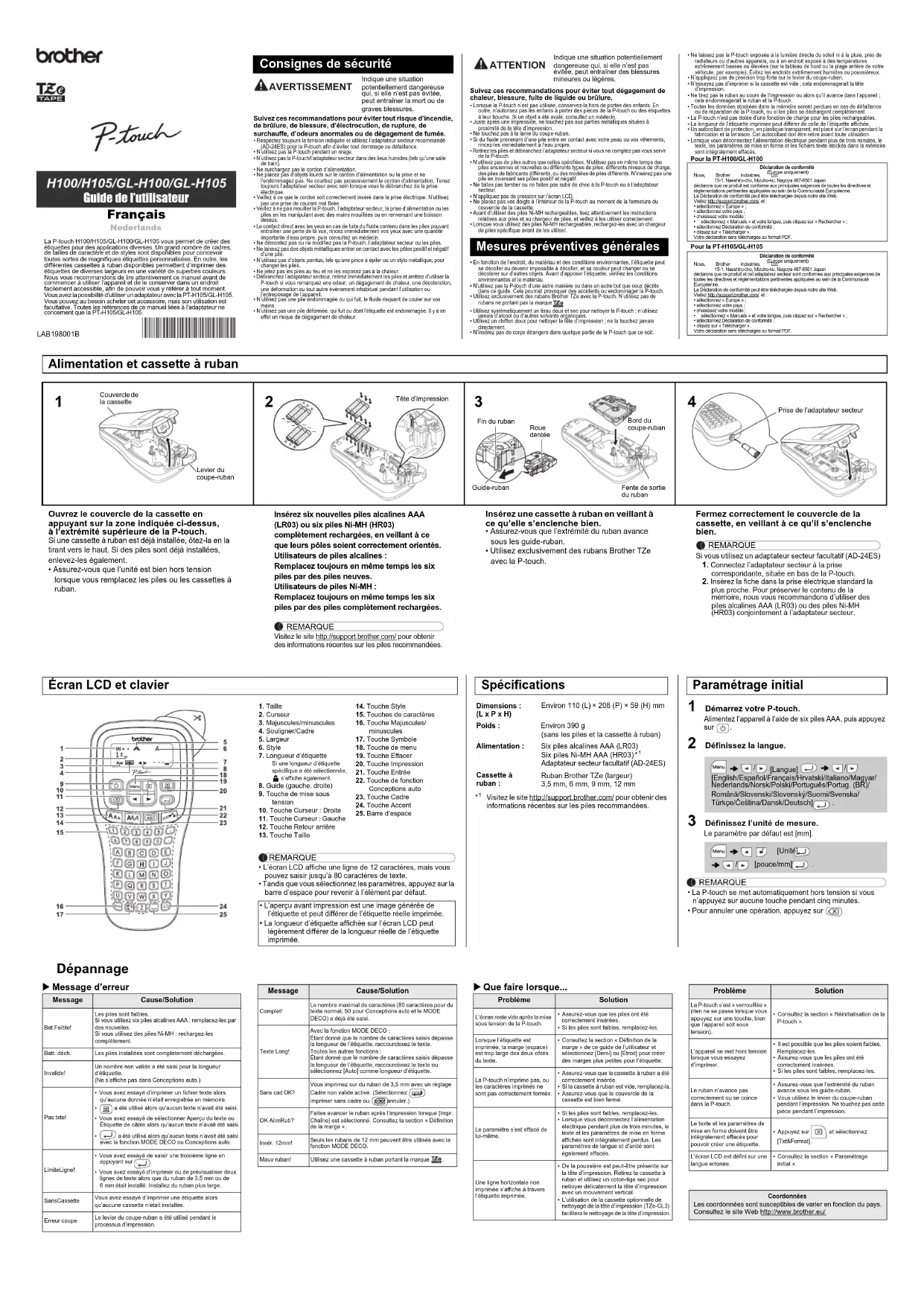 Suivez ces recommandations pour éviter tout risque d’incendie, de brûlure, de blessure, d’électrocution, de rupture, de surchauffe, d’odeurs anormales ou de dégagement de fumée.• Respectez toujours la tension indiquée et utilisez l’adaptateur secteur recommandé (AD-24ES) pour la P-touch afin d’éviter tout dommage ou défaillance.• N’utilisez pas la P-touch pendant un orage.• N’utilisez pas la P-touch/l’adaptateur secteur dans des lieux humides (tels qu’une salle de bain).• Ne surchargez pas le cordon d’alimentation.• Ne placez pas d’objets lourds sur le cordon d’alimentation ou la prise et ne l’endommagez pas. Ne courbez pas excessivement le cordon d’alimentation. Tenez toujours l’adaptateur secteur avec soin lorsque vous le débranchez de la prise électrique.• Veillez à ce que le cordon soit correctement inséré dans la prise électrique. N’utilisez pas une prise de courant mal fixée.• Veillez à ne pas mouiller la P-touch, l’adaptateur secteur, la prise d’alimentation ou les piles en les manipulant avec des mains mouillées ou en renversant une boisson dessus.• Le contact direct avec les yeux en cas de fuite du fluide contenu dans les piles pouvant entraîner une perte de la vue, rincez immédiatement vos yeux avec une quantité importante d’eau propre, puis consultez un médecin.• Ne démontez pas ou ne modifiez pas la P-touch, l’adaptateur secteur ou les piles.• Ne laissez pas des objets métalliques entrer en contact avec les pôles positif et négatif d’une pile.• N’utilisez pas d’objets pointus, tels qu’une pince à épiler ou un stylo métallique, pour changer les piles.• Ne jetez pas les piles au feu et ne les exposez pas à la chaleur.• Débranchez l’adaptateur secteur, retirez immédiatement les piles et arrêtez d’utiliser la P-touch si vous remarquez une odeur, un dégagement de chaleur, une décoloration, une déformation ou tout autre événement inhabituel pendant l’utilisation ou l’entreposage de l’appareil.• N’utilisez pas une pile endommagée ou qui fuit, le fluide risquant de couler sur vos mains.• N’utilisez pas une pile déformée, qui fuit ou dont l’étiquette est endommagée. Il y a en effet un risque de dégagement de chaleur.Suivez ces recommandations pour éviter tout dégagement de chaleur, blessure, fuite de liquide ou brûlure.• Lorsque la P-touch n’est pas utilisée, conservez-la hors de portée des enfants. En outre, n’autorisez pas les enfants à porter des pièces de la P-touch ou des étiquettes à leur bouche. Si un objet a été avalé, consultez un médecin.• Juste après une impression, ne touchez pas aux parties métalliques situées à proximité de la tête d’impression.• Ne touchez pas à la lame du coupe-ruban.• Si du fluide provenant d’une pile entre en contact avec votre peau ou vos vêtements, rincez-les immédiatement à l’eau propre.• Retirez les piles et débranchez l’adaptateur secteur si vous ne comptez pas vous servir de la P-touch.• N’utilisez pas de piles autres que celles spécifiées. N’utilisez pas en même temps des piles anciennes et nouvelles ou différents types de piles, différents niveaux de charge, des piles de fabricants différents, ou des modèles de piles différents. N’insérez pas une pile en inversant ses pôles positif et négatif.• Ne faites pas tomber ou ne faites pas subir de choc à la P-touch ou à l’adaptateur secteur.• N’appliquez pas de pression sur l’écran LCD.• Ne placez pas vos doigts à l’intérieur de la P-touch au moment de la fermeture du couvercle de la cassette. • Avant d’utiliser des piles Ni-MH rechargeables, lisez attentivement les instructions relatives aux piles et au chargeur de piles, et veillez à les utiliser correctement.• Lorsque vous utilisez des piles Ni-MH rechargeables, rechargez-les avec un chargeur de piles spécifique avant de les utiliser.• En fonction de l’endroit, du matériau et des conditions environnantes, l’étiquette peut se décoller ou devenir impossible à décoller, et sa couleur peut changer ou se décolorer sur d’autres objets. Avant d’apposer l’étiquette, vérifiez les conditions environnantes et le matériau.• N’utilisez pas la P-touch d’une autre manière ou dans un autre but que ceux décrits dans ce guide. Cela pourrait provoquer des accidents ou endommager la P-touch.• Utilisez exclusivement des rubans Brother TZe avec la P-touch. N’utilisez pas de rubans ne portant pas la marque .• Utilisez systématiquement un tissu doux et sec pour nettoyer la P-touch ; n’utilisez jamais d’alcool ou d’autres solvants organiques.• Utilisez un chiffon doux pour nettoyer la tête d’impression ; ne la touchez jamais directement.• N’insérez pas de corps étrangers dans quelque partie de la P-touch que ce soit.• Ne laissez pas la P-touch exposée à la lumière directe du soleil ni à la pluie, près de radiateurs ou d’autres appareils, ou à un endroit exposé à des températures extrêmement basses ou élevées (sur le tableau de bord ou la plage arrière de votre véhicule, par exemple). Évitez les endroits extrêmement humides ou poussiéreux.• N’appliquez pas de pression trop forte sur le levier du coupe-ruban.• N’essayez pas d’imprimer si la cassette est vide ; cela endommagerait la tête d’impression.• Ne tirez pas le ruban au cours de l’impression ou alors qu’il avance dans l’appareil ; cela endommagerait le ruban et la P-touch.• Toutes les données stockées dans la mémoire seront perdues en cas de défaillance ou de réparation de la P-touch, ou si les piles se déchargent complètement.• La P-touch n’est pas dotée d’une fonction de charge pour les piles rechargeables.• La longueur de l’étiquette imprimée peut différer de celle de l’étiquette affichée.• Un autocollant de protection, en plastique transparent, est placé sur l’é
