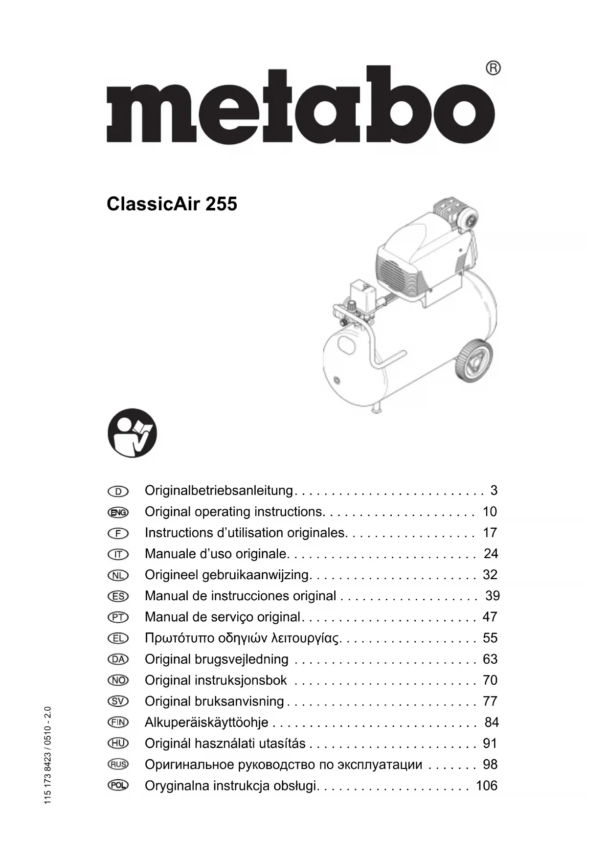 Retrouvez gratuitement la notice de l'appareil Classic Air 255 METABO au format PDF.