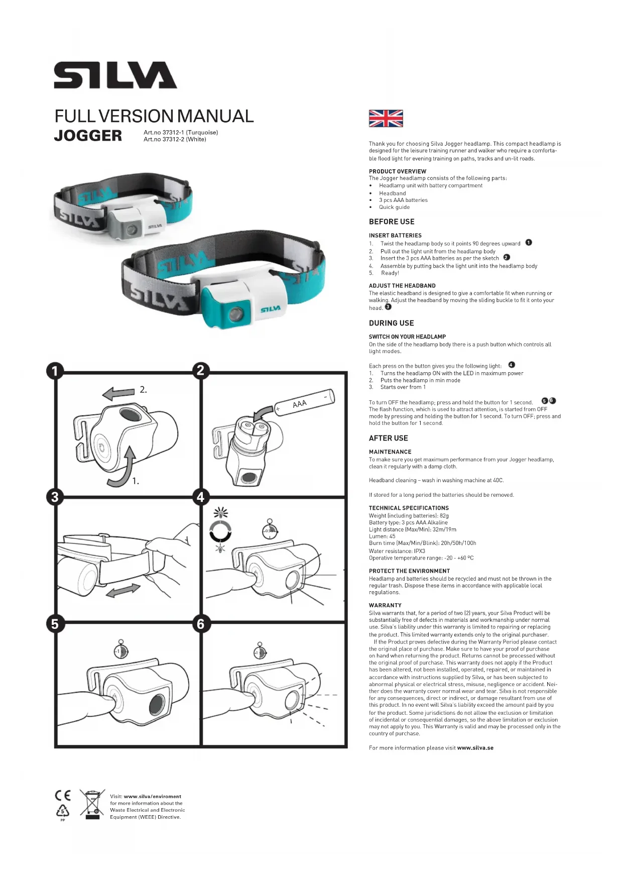 Merci d'avoir choisi la lampe frontale Silva Jogger. Cette lampe frontale compacte es concue pour le jogging et la marche, necessitant un eclairage comfortable pour l'entrainment sur les chemins, les routes, les sentiers et les routes non-eclairés.