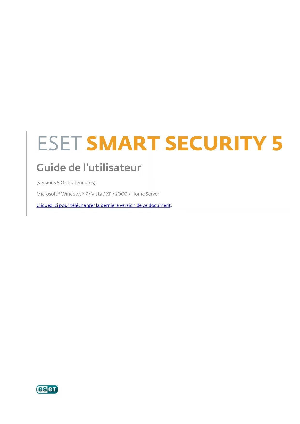 Guide de l’utilisateur (versions 5.0 et ultérieures) Microsoft® Windows® 7 / Vista / XP / 2000 / Home Server Cliquez ici pour télécharger la dernière version de ce document.ESET Smart Security Copyright ©2011 ESET, spol. s r. o. ESET Smart Security a été développé par ESET, spol. s r. o. Pour plus d'informations, visitez www.eset.com. Tous droits réservés. Aucune partie de cette documentation ne peut être reproduite, stockée dans un système d'archivage ou transmise sous quelque forme ou par quelque moyen que ce soit, électronique, mécanique, photocopie, enregistrement, numérisation ou autre, sans l'autorisation écrite de l'auteur. ESET, spol. s r. o. se réserve le droit de modifier les applications décrites sans préavis. Assistance clientèle internationale : www.eset.com/support/contact RÉV. 9/8/2011Table des