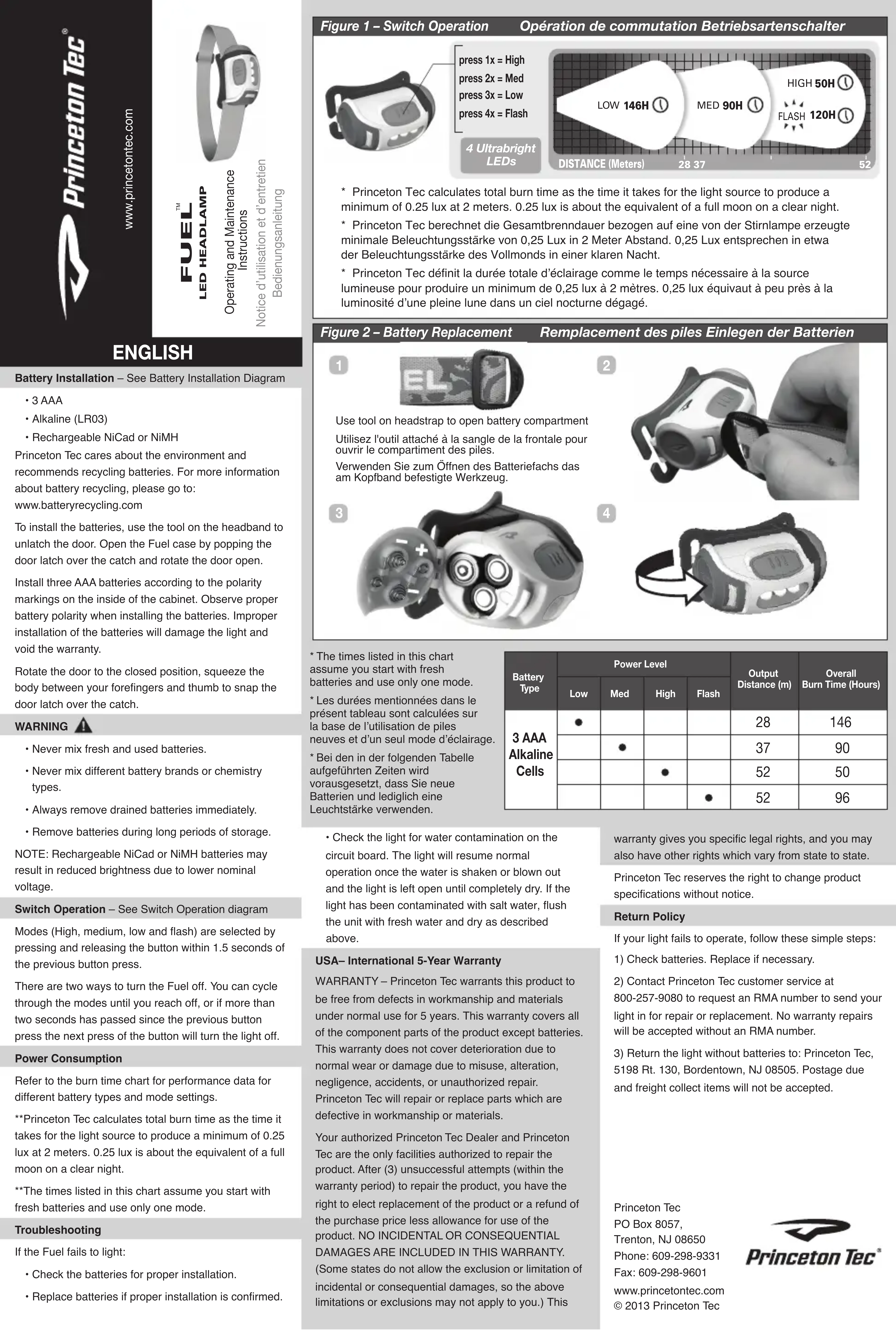 GARANTIE - Princeton Tec garantit au propriétaire initial, tant qu'il possède ce produit, que ce produit, utilisé dans le cadre d'une activités normale, n'a pas de défauts de matériel ou de fabrication. Cette garantie couvre toutes les pieces composantes du produit sauf les piles. Cette garantie ne couvres pas les déteriorations causées par l'usure normale ni les dommages provoqués par une utilisation abusive, des modifications, la néligence, les accidents ou par une réparation non agrée. Princeton Tec réparera ou replacera les pieces qui souffrent de début matériel ou de fabrication.