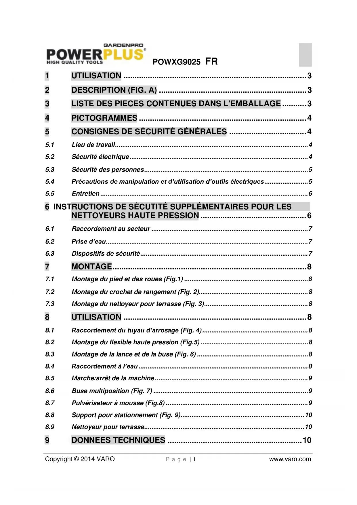 enfants ne doivent pas jouer avec des sacs en plastique ! Il existe un risque de suffocation! 1x nettoyeur sur roues 1x gâchette 1x lance de rallonge pour le pistolet 1x bouteille de savon 1x buse réglable 1x buse turbo 1x connecteur d’arrivée d’eau mâle 1x flexible de pression de 3 m 1x chariot 4x vis de chariot 1x manuel général 1x consigne de nettoyage d’aiguille et de buse 1x nettoyeur pour terrasse En cas de pièces manquantes ou endommagées, contactez votre revendeur.POWXG9025 FR Copyright © 2014 VARO P a g e | 4 www.varo.com 4 PICTOGRAMMES Les symboles suivants sont utilisés dans ce mode d’emploi et/ou sur la machine :