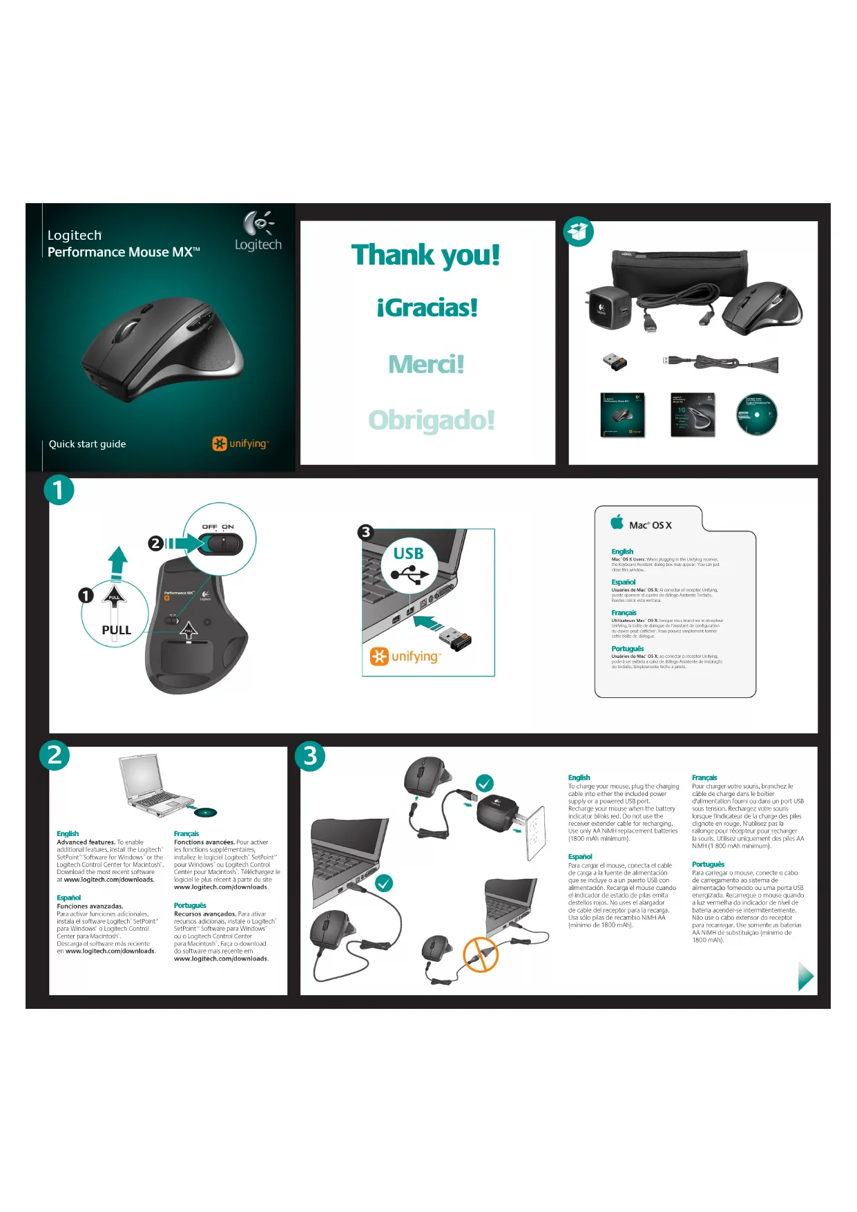 Português 2. Assurez-vous que les piles sont chargées et que la polarité des piles est respectée.3. Branchez le récepteur Unifying sur un autre port USB. 4. Essayez de reconnecter la souris et le récepteur Unifying à l'aide du logiciel Logitech Unifying (reportez-vous à la section Unifying de ce guide).Pointeur incontrôlable ou clics sans résultat? 1. Déplacez tout objet métallique se trouvant entre la souris et le récepteur Unifying. 2. Si le récepteur Unifying est branché dans un hub USB, branchez-le plutôt directement sur l'ordinateur.3. Rapprochez le récepteur Unifying de la souris en utilisant la rallonge pour récepteur fournie.Si ces conseils ne donnent aucun résultat, contactez le Service clientèle de Logitech à l'adresse www.logitech.com/support ou par téléphone aux numéros fournis dans ce guide. Português O ponteiro não se move? 1. Verifique se o comutador de força está na posição ON. 2. Confira se as baterias estão carregadas e as polaridades estão corretas.3. Tente conectar o receptor Unifying a uma outra porta USB.4. Tente reconectar o mouse e o receptor Unifying usando o software Logitech Unifying (consulte a seção Unifying neste guia).Movimentos aleatórios do ponteiro ou cliques de botão sem efeito?1. Remova objetos metálicos entre o mouse e o receptor Unifying.2. Se o receptor Unifying estiver conectado a um concentrador USB, tente conectá-lo diretamente ao computador.3. Mova o receptor Unifying para mais perto do mouse usando o cabo extensor do receptor incluído.Se estas dicas não ajudarem, contate o atendimento ao cliente da Logitech em www.logitech.com/support ou telefone usando os números de telefone listados neste guia.