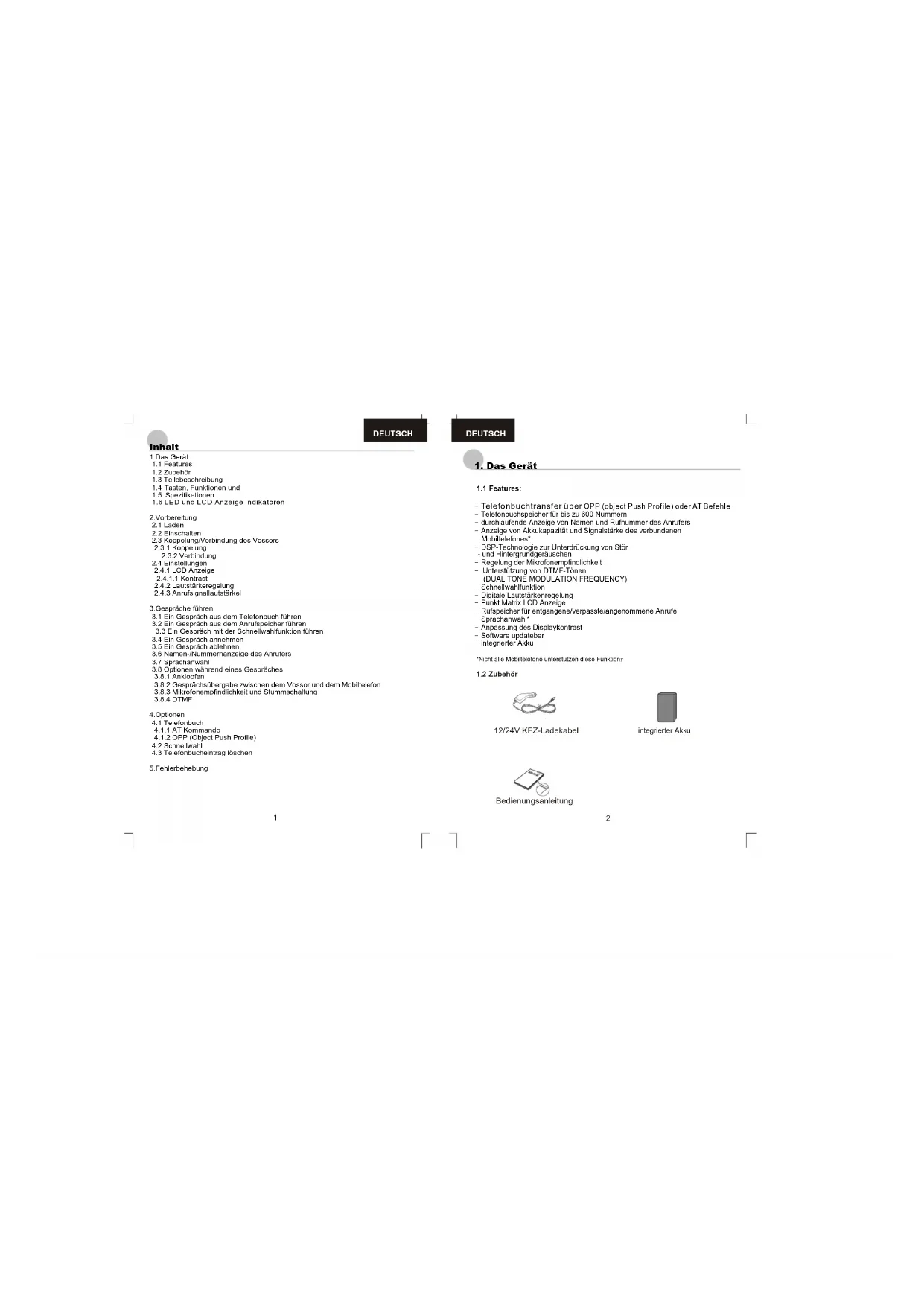 Francais Francais5. Dépannage La force du signal réseau/capacité de charge ne s'affiche pas : Cette fonction n'est pas supportée par tous les téléphones mobiles Couplage impossible : 1.Allumez le Vossor et éteignez le, puis réessayez. 2.Eteignez les autres appareils Bluetooth avant le couplage. Volume pas assez fort : Mettez le volume à fond au cours d'une communication avec votre téléphone mobile. Le correspondant entend à peine l'utilisateur du Vossor : Essayez les étapes suivantes au cours d'une communication 1.Mettez la sensibilité du microphone du Vossor à un niveau élevé ou 2.le correspondant met le volume de son téléphone mobile à fond. Le correspondant entend un écho bruyant : Transférez votre communication vers votre téléphone mobile et écoutez. Si l'écho est disparu, retransférez la communication au Vossor et baissez le volume jusqu'à ce que l'écho disparaisse. Si l'écho est également présent lors de la communication avec le téléphone mobile, il est dû au téléphone ou au réseau et ne peut être supprimé par le Vossor. Le volume est trop fort/faible et ne peut être réglé : Réglez d'abord le volume sur votre téléphone portable et utilisez le réglage du volume du Vossor pour un réglage en précision. Un numéro composé n'apparaît pas dans la mémoire d'appels : Les numéros composés directement sur le téléphone portable ne peuvent pas être transférés dans la mémoire d'appels du Vossor. Francais 15Indice 1. L'apparecchio 1.1 Caratteristiche 1.2 Accessori 1.3 Descrizione delle parti 1.4 Tasti e funzioni 1.5 Dati tecnici 1.6 Indicatori luminosi LED e LCD2. Preparazione 2.1 Messa in carica 2.2 Accensione 2.3 Collegamento/Connessione 2.3.1 Collegamento 2.3.2 Connessione 2.4 Impostazioni 2.4.1 Display LCD 2.4.1.1 Contrasto 2.4.2 Regolazione del volume 2.4.3 Regolazione del volume del segnale di chiamata3. Fare una chiamata 3.1 Fare una chiamata utilizzando la rubrica 3.2 Fare una chiamata utilizzando il registro chiamate 3.3 Fare una chiamata utilizzando la funzione di selezione rapida 3.4 Rispondere ad una chiamata 3.5 Rifiutare una chiamata 3.6 Indicazione del nome e del numero di chi chiama 3.7 Selezione vocale 3.8 Opzioni durante una chiamata 3.8.1 Servizio di chiamata in attesa 3.8.2 Trasferimento di chiamata tra il Vassor e il cellulare 3.8.3 Ricettività del microfono e silenziatore 3.8.4 Sistema DTMF4. Opzioni 4.1 Rubrica telefonica 4.1.1 Comando AT 4.1.2 OPP (Object Push Profile)4.2 Selezione rapida4.3 Eliminare voci dalla rubrica5. Eliminare gli errori