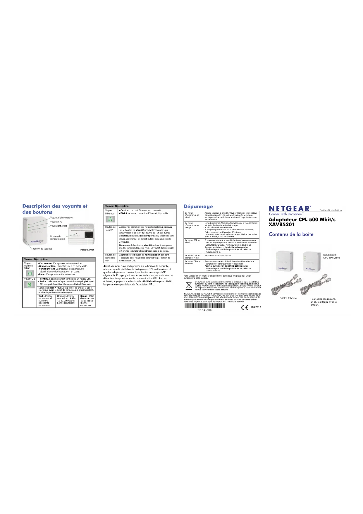 Remarque: le bouton de sécurité ne fonctionne pas en mode économie d'énergie (voir «Le voyant d'alimentation est orange» dans le tableau Dépannage ci-dessous). Bouton de réinitialisa- tion Appuyez sur le bouton de réinitialisation pendant 1seconde pour rétablir les paramètres par défaut de l'adaptateur CPL. Elément Description Adaptateurs CPL 500 Mbit/s Câbles Ethernet Pour certaines régions, un CD est fourni avec le produit.Réseau CPL existant Ajouter un adaptateur CPL Les adaptateurs HomePlug AV compatibles avec le XAV5201 sont : XAV101, XAV1004, XAV2001, XAV2501, et XAVN2001 NETGEAR. Pour consulter la liste complète des périphériques certifiés HomePlug AV, rendez-vous à l'adresse http://www.homeplug.org/certified_products. Pièce 1 Pièce 2 Pièce 3 Informations de sécurité