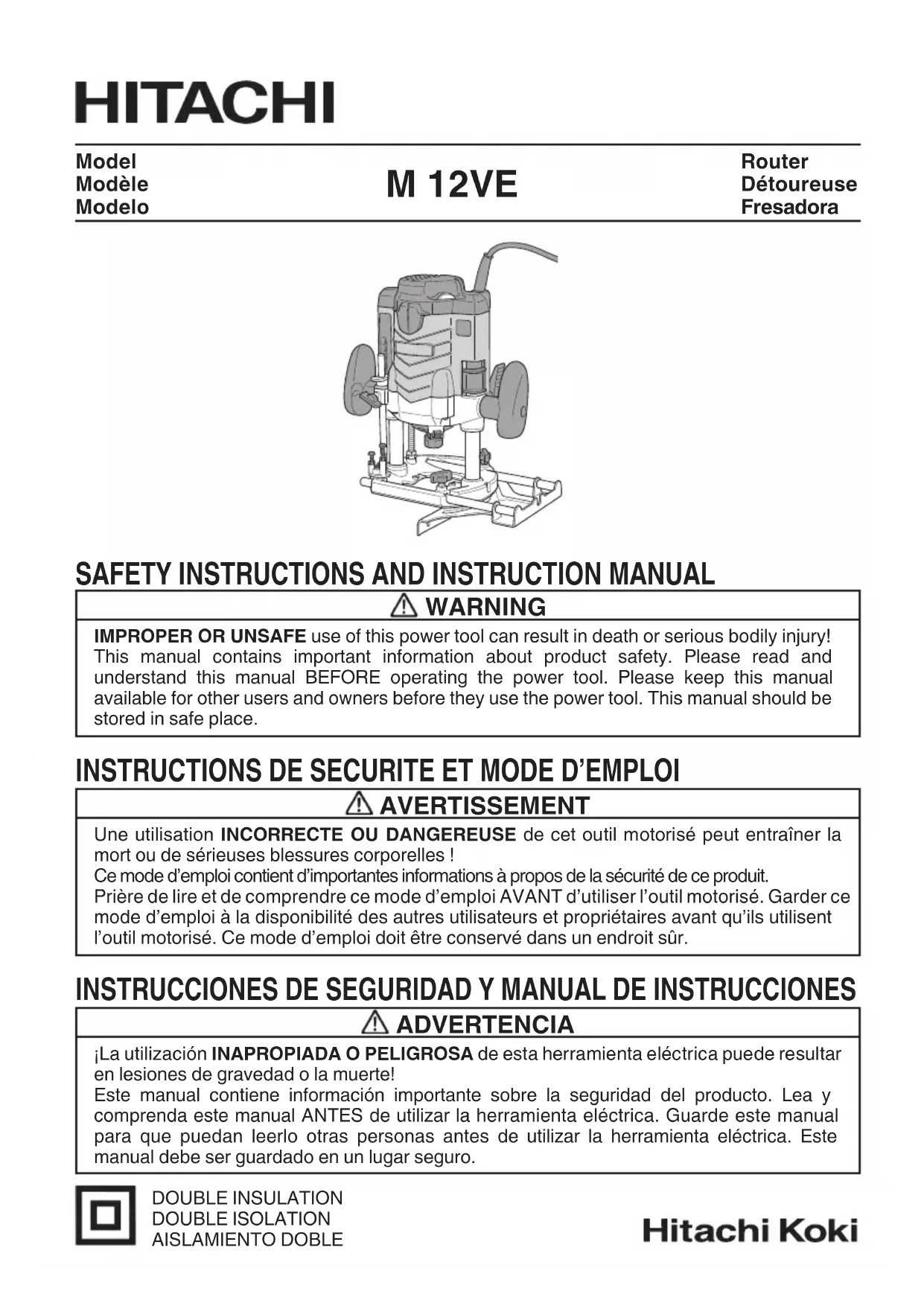 M12VE - Fraiseuse HITACHI - Notice d'utilisation et mode d'emploi gratuit