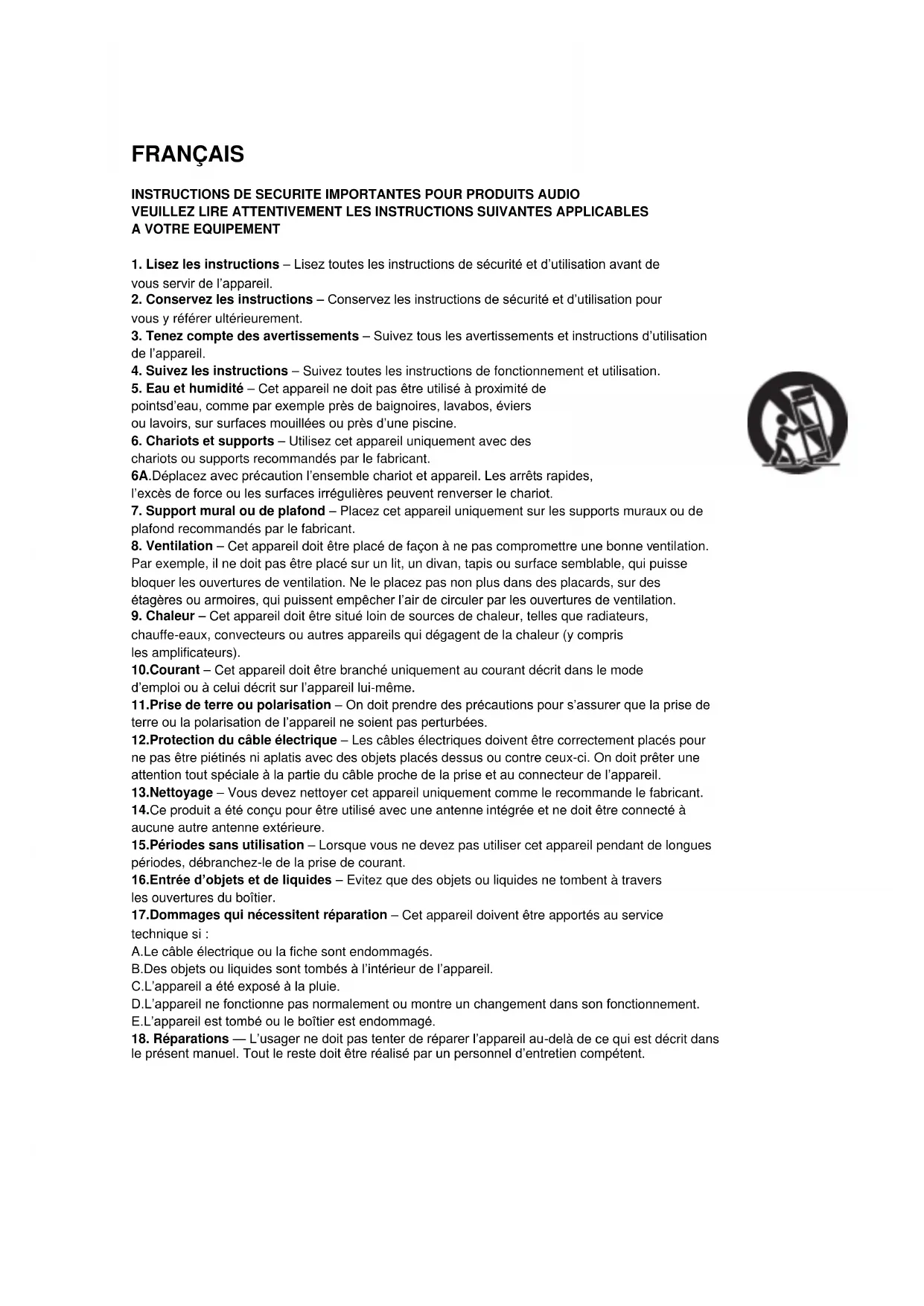 - Chariots et supports - Utilisez cet apparéil uniquement avec des chariots ou supports recommendés par le fabricant.