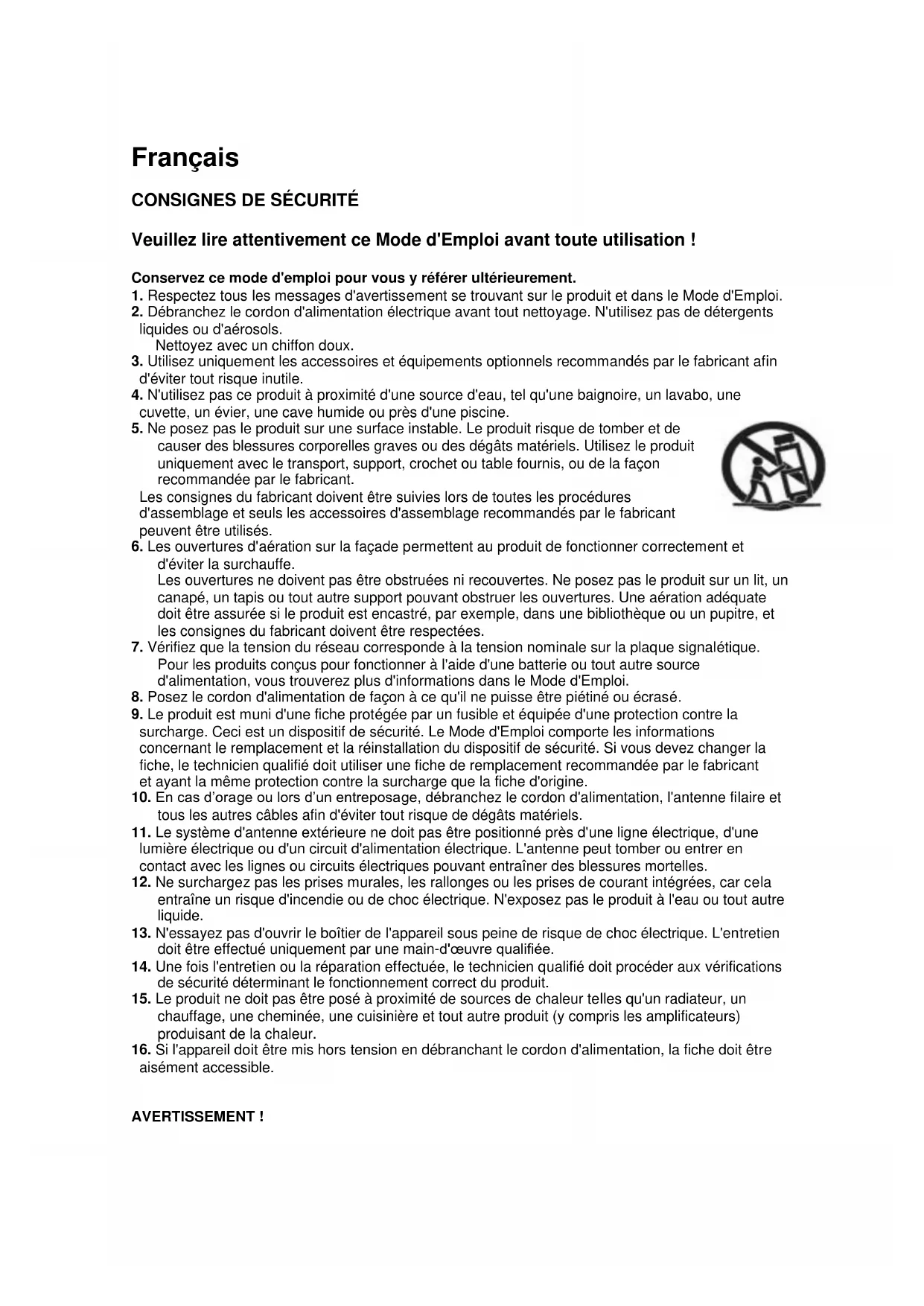 - Respectez tous les messages d'advertisement se trouvant sur le produit et dans le Mode d'Emploi.