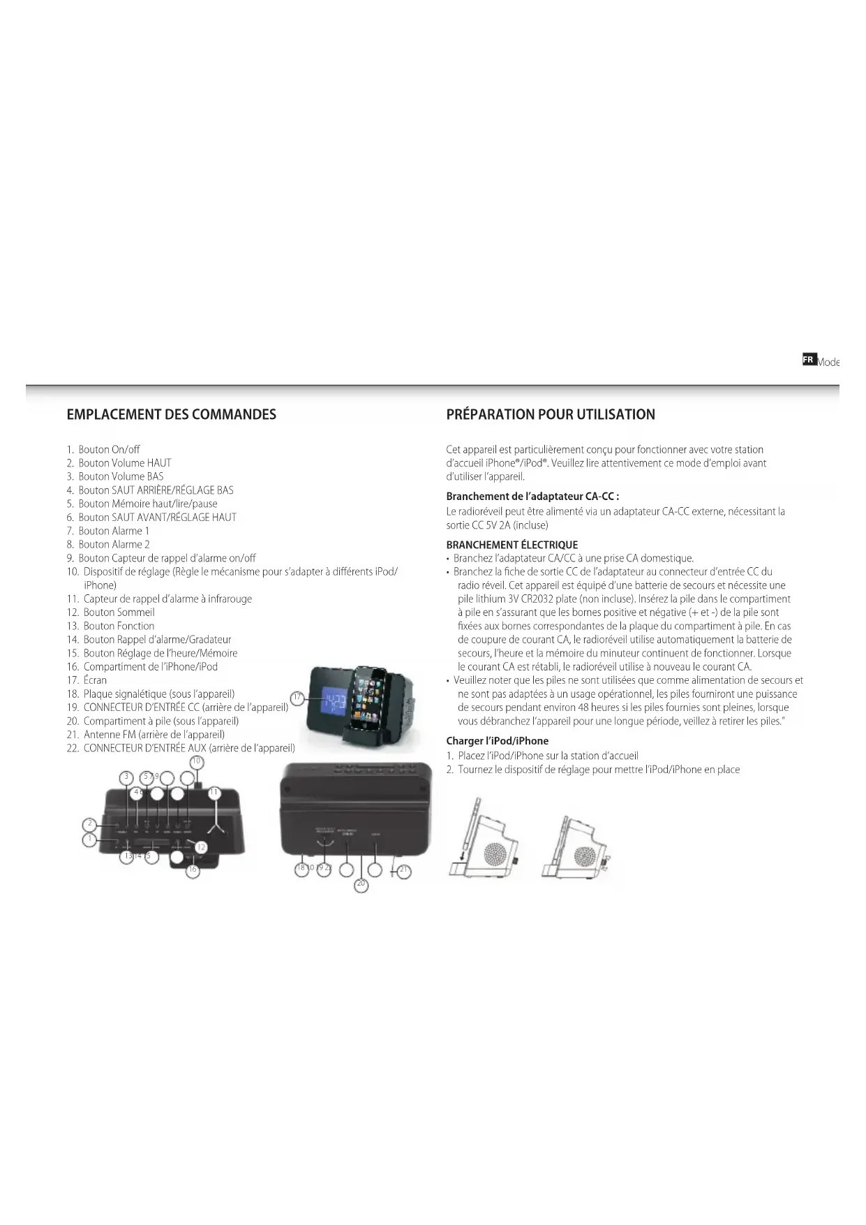 Cet appareil est particulièrement conçu pour fonctionner avec votre station d’accueil iPhone®/iPod®. Veuillez lire attentivement ce mode d’emploi avant d’utiliser l’appareil. Branchement de l’adaptateur CA-CC : Le radioréveil peut être alimenté via un adaptateur CA-CC externe, nécessitant la sortie CC 5V 2A (incluse) BRANCHEMENT ÉLECTRIQUE