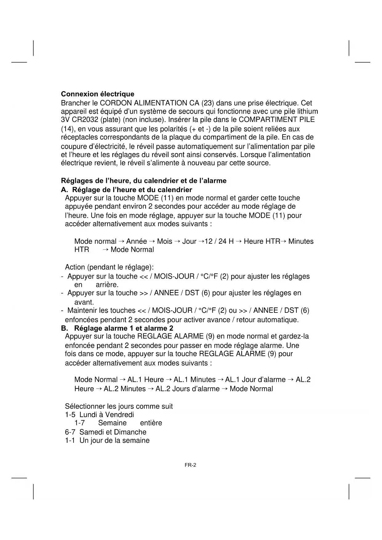 FR-1 FRENCHFR-2 Connexion électrique Brancher le CORDON ALIMENTATION CA (23) dans une prise électrique. Cet appareil est équipé d’un système de secours qui fonctionne avec une pile lithium 3V CR2032 (plate) (non incluse). Insérer la pile dans le COMPARTIMENT PILE (14), en vous assurant que les polarités (+ et -) de la pile soient reliées aux réceptacles correspondants de la plaque du compartiment de la pile. En cas de coupure d’électricité, le réveil passe automatiquement sur l’alimentation par pile et l’heure et les réglages du réveil sont ainsi conservés. Lorsque l’alimentation électrique revient, le réveil s’alimente à nouveau par cette source. Réglages de l’heure, du calendrier et de l’alarme A. Réglage de l’heure et du calendrier Appuyer sur la touche MODE (11) en mode normal et garder cette touche appuyée pendant environ 2 secondes pour accéder au mode réglage de l’heure. Une fois en mode réglage, appuyer sur la touche MODE (11) pour accéder alternativement aux modes suivants : Mode normal → Année → Mois → Jour →12 / 24 H → Heure HTR→ Minutes HTR → Mode Normal Action (pendant le réglage): - Appuyer sur la touche << / MOIS-JOUR / °C/°F (2) pour ajuster les réglages en arrière. - Appuyer sur la touche >> / ANNEE / DST (6) pour ajuster les réglages en avant. - Maintenir les touches << / MOIS-JOUR / °C/°F (2) ou >> / ANNEE / DST (6) enfoncées pendant 2 secondes pour activer avance / retour automatique. B. Réglage alarme 1 et alarme 2 Appuyer sur la touche REGLAGE ALARME (9) en mode normal et gardez-la enfoncée pendant 2 secondes pour passer en mode réglage alarme. Une fois dans ce mode, appuyer sur la touche REGLAGE ALARME (9) pour accéder alternativement aux modes suivants : Mode Normal → AL.1 Heure → AL.1 Minutes → AL.1 Jour d’alarme → AL.2 Heure → AL.2 Minutes → AL.2 Jours d’alarme → Mode Normal Sélectionner les jours comme suit 1-5 Lundi à Vendredi 1-7 Semaine entière 6-7 Samedi et Dimanche 1-1 Un jour de la semaineFR-3 Action (pendant le réglage): - Appuyer sur la touche << / MOIS-JOUR / °C/°F (2) pour ajuster le réglage vers l’arrière. - Appuyer sur la touche >> / ANNEE / DST (6) pour ajuster le réglage vers l’avant. - Garder les touches << / ANNEE-MOIS-JOUR (3) ou >> / DST (4) enfoncées pendant 2 secondes pour activer avance / retour automatique. Réglage du type d’alarme et mise en / hors fonction de l’alarme - Mettre les touches ALARME 1 RADIO / SONNERIE (1) / ALARME 2 RADIO / SONNERIE (7) en position musique pour être réveillé par la radio et en position sonnerie pour être réveillé par la sonnerie, la position alarme éteinte servant à éteindre celle-ci. - Régler le commutateur AFFICHAGE VARIATEUR DE LUMIERE BAS / HAUT / AUTO ETEINT (25) sur la position AUTO OFF (l’affi chage s’éteint automatiquement après 15 secondes). Lorsque l’alarme sonne (quelque soit le mode), l’affi chage s’allume à nouveau automatiquement. Durée de l’alarme et fonction répétition A. Durée de l’alarme La sonnerie ou la radio retentissent pendant 30 minutes si aucune touche n’est pressée puis s’arrête automatiquement jusqu’au lendemain. B. Fonction répétition - Pendant l’alarme, appuyer sur la touche REPETITION / SOMMEIL (10) pour mettre la fonction répétition en marche et la sonnerie ou la radio s’arrêtera. - La durée de silence avant répétition est de 9 minutes - La répétition continuera à moins que la touche MARCHE / ARRET (12) ne soit activée pour mettre fi n à l’alarme. Sans cela l’alarme s’arrête automatiquement après 30 minutes. - Mettre le commutateur AFFICHAGE LUMINEUX FAIBLE / FORT / ARRÊT AUTO(25) en position ARRÊT AUTO (l’affi chage s’éteint automatiquement après 15 secondes). Lorsque l’alarme se déclenche, l’affi chage s’allume automatiquement. Appuyer sur la touche REPETITION / SOMMEIL (10) pour mettre la fonction répétition en marche, arrêter l’alarme et éteindre l’affi chage. Changer l’affichage Appuyer sur la touche << / MOIS-JOUR / °C/°F (2) pour affi cher les Mois / Jour, après 5 secondes sans autre action, l’affi chage montre automatiquement l’heure à nouveau.FR-4 Appuyer sur la touche >> / ANNEE / DST (6) pour affi cher l’Année, après 5 secondes sans autre action, l’affi chage montre automatiquement l’heure à nouveau. Fonction sommeil Lorsque la radio est allumée, appuyer sur la touche REPETITION / SOMMEIL (10) pour passer en mode sommeil. La durée du mode sommeil va clignoter pendant 5 secondes. Durant ce laps de temps, appuyer à nouveau sur la touche REPETITION / SOMMEIL (10) pour faire varier la durée de 90 à 15 minutes. Appuyer sur la touche MARCHE / ARRET (12) pour annuler cette fonction sommeil. Variateur de luminosité d’affichage Lorsque la radio est éteinte, régler le mode AFFICHAGE LUMINEUX FAIBLE / FORT / ARRÊT AUTO(25) sur ARRÊT AUTO, l’affi chage LCD s’éteindra alors automatiquement après 15 secondes. - Appuyer sur n’importe quelle touche et il s’allumera à nouveau. DST – Heure d’été (heure d’été et d’hiver) Appuyer sur la touche >> / DST (6) et la maintenir enfoncée pendant 3 secondes pour passer en heure d’été ou en heure d’hiver. Utilisation de la radio - Appuyer sur la touche MARCHE / ARRET (12) pour allumer la radio. - Régler le commutateur BANDE AM / FM (11) sur le type de fréquences souhaité. - Choisir la station à l’aide de la molette de réglage de fréquence (17). - Tourner la molette de réglage de VOLUME (24) pour ajuster le volume au niveau souhaité. - Appuyer à nouveau sur la touche MARCHE / ARRET (12) pour éteindre la radio. Notes : - La bande AM utilise une antenne interne, faire pivoter la radio pour obtenir une meilleure réception. - S’assurer que l’antenne FM (22) soit entièrement déroulée et étendue pour une meilleure réception FM.FR-5 Entrée Jack L’entrée ENTREE JACK (18) peut