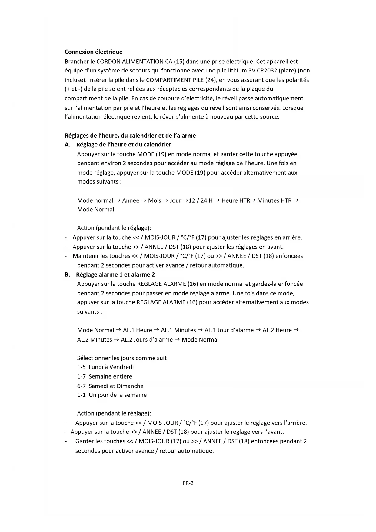 Connexion électrique Brancher le CORDON ALIMENTATION CA (15) dans une prise électrique. Cet appareil est équipé d’un système de secours qui fonctionne avec une pile lithium 3V CR2032 (plate) (non incluse). Insérer la pile dans le COMPARTIMENT PILE (24), en vous assurant que les polarités (+ et -) de la pile soient reliées aux réceptacles correspondants de la plaque du compartiment de la pile. En cas de coupure d’électricité, le réveil passe automatiquement sur l’alimentation par pile et l’heure et les réglages du réveil sont ainsi conservés. Lorsque l’alimentation électrique revient, le réveil s’alimente à nouveau par cette source. Réglages de l’heure, du calendrier et de l’alarme A. Réglage de l’heure et du calendrier Appuyer sur la touche MODE (19) en mode normal et garder cette touche appuyée pendant environ 2 secondes pour accéder au mode réglage de l’heure. Une fois en mode réglage, appuyer sur la touche MODE (19) pour accéder alternativement aux modes suivants : Mode normal Année Mois Jour 12 / 24 H Heure HTR Minutes HTR Mode Normal Action (pendant le réglage): - Appuyer sur la touche << / MOIS-JOUR / °C/°F (17) pour ajuster les réglages en arrière. - Appuyer sur la touche >> / ANNEE / DST (18) pour ajuster les réglages en avant. - Maintenir les touches << / MOIS-JOUR / °C/°F (17) ou >> / ANNEE / DST (18) enfoncées pendant 2 secondes pour activer avance / retour automatique. B. Réglage alarme 1 et alarme 2 Appuyer sur la touche REGLAGE ALARME (16) en mode normal et gardez-la enfoncée pendant 2 secondes pour passer en mode réglage alarme. Une fois dans ce mode, appuyer sur la touche REGLAGE ALARME (16) pour accéder alternativement aux modes suivants : Mode Normal AL.1 Heure AL.1 Minutes AL.1 Jour d’alarme AL.2 Heure AL.2 Minutes AL.2 Jours d’alarme Mode Normal Sélectionner les jours comme suit 1-5 Lundi à Vendredi 1-7 Semaine entière 6-7 Samedi et Dimanche 1-1 Un jour de la semaine Action (pendant le réglage): - Appuyer sur la touche << / MOIS-JOUR / °C/°F (17) pour ajuster le réglage vers l’arrière. - Appuyer sur la touche >> / ANNEE / DST (18) pour ajuster le réglage vers l’avant. - Garder les touches << / MOIS-JOUR (17) ou >> / ANNEE / DST (18) enfoncées pendant 2 secondes pour activer avance / retour automatique.FR-3 Réglage du type d’alarme et mise en / hors fonction de l’alarme - Mettre les touches ALARME 1 RADIO / SONNERIE (5) / ALARME 2 RADIO / SONNERIE (6) en position musique pour être réveillé par la radio et en position sonnerie pour être réveillé par la sonnerie, la position alarme éteinte servant à éteindre celle-ci.. - Régler le commutateur AFFICHAGE VARIATEUR DE LUMIERE BAS / HAUT / AUTO ETEINT (20) sur la position AUTO OFF (l’affichage s’éteint automatiquement après 15 secondes). Lorsque l’alarme sonne (quelque soit le mode), l’affichage s’allume à nouveau automatiquement. Durée de l’alarme et fonction répétition A. Durée de l’alarme La sonnerie ou la radio retentissent pendant 30 minutes si aucune touche n’est pressée puis s’arrête automatiquement jusqu’au lendemain. B. Fonction répétition - Pendant l’alarme, appuyer sur la touche REPETITION / SOMMEIL (3) pour mettre la fonction répétition en marche et la sonnerie ou la radio s’arrêtera. - La durée de silence avant répétition est de 9 minutes - La répétition continuera à moins que la touche MARCHE / ARRET (4) ne soit activée pour mettre fin à l’alarme. Sans cela l’alarme s’arrête automatiquement après 30 minutes. - Mettre le commutateur AFFICHAGE LUMINEUX FAIBLE / FORT / ARRÊT AUTO(20) en position ARRÊT AUTO (l’affichage s’éteint automatiquement après 15 secondes). Lorsque l’alarme se déclenche, l’affichage s’allume automatiquement. Appuyer sur la touche REPETITION / SOMMEIL (3) pour mettre la fonction répétition en marche, arrêter l’alarme et éteindre l’affichage. Changer l’affichage Appuyer sur la touche << / MOIS-JOUR / °C/°F (17) pour afficher les Mois / Jour, après 5 secondes sans autre action, l’affichage montre automatiquement l’heure à nouveau. Appuyer sur la touche >> / ANNEE / DST (18) pour afficher l’Année, après 5 secondes sans autre action, l’affichage montre automatiquement l’heure à nouveau. Fonction sommeil Lorsque la radio est allumée, appuyer sur la touche REPETITION / SOMMEIL (3) pour passer en mode sommeil. La durée du mode sommeil va clignoter pendant 5 secondes. Durant ce laps de temps, appuyer à nouveau sur la touche REPETITION / SOMMEIL (3) pour faire varier la durée de 90 à 15 minutes. Appuyer sur la touche MARCHE / ARRET (4) pour annuler cette fonction sommeil. Variateur de luminosité d’affichage Lorsque la radio est éteinte, régler le mode AFFICHAGE LUMINEUX FAIBLE / FORT / ARRÊT AUTO(20) sur ARRÊT AUTO, l’affichage LCD s’éteindra alors automatiquement après 15 secondes. - Appuyer sur n’importe quelle touche et il s’allumera à nouveau.FR-4 DST – Heure d’été (heure d’été et d’hiver) Appuyer sur la touche >> / ANNEE / DST (18) et la maintenir enfoncée pendant 3 secondes pour passer en heure d’été ou en heure d’hiver. Utilisation de la radio - Appuyer sur la touche MARCHE / ARRET (4) pour allumer la radio. - Régler le commutateur BANDE AM / FM (2) sur le type de fréquences souhaité. - Choisir la station à l’aide de la molette de réglage de fréquence (23). - Tourner la molette de réglage de VOLUME (22) pour ajuster le volume au niveau souhaité. - Appuyer à nouveau sur la touche MARCHE / ARRET (4) pour éteindre la radio. Notes : - La bande AM utilise une antenne interne, faire pivoter la radio pour obtenir une meilleure réception. - S’assurer que l’antenne FM (14) soit entièrement déroulée et étendue pour une meilleure réception FM. Entrée Jack L’entrée ENTREE JACK (7) peut être utilisée pour relier une source audio externe aux hauts parleur