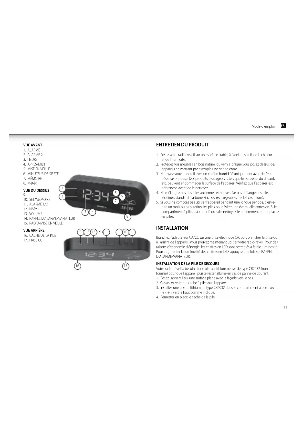 Mode d’emploi12 Remarque : cette pile sert uniquement à alimenter l'appareil en cas de panne de courant. Une pile neuve de type CR2032 peut alimenter votre radio-réveil en continu pendant environ 3 jours. RÉGLAGE DE L'HEURE, FORMAT 12/24 H ET DÉLAI DE RAPPEL D'ALARME