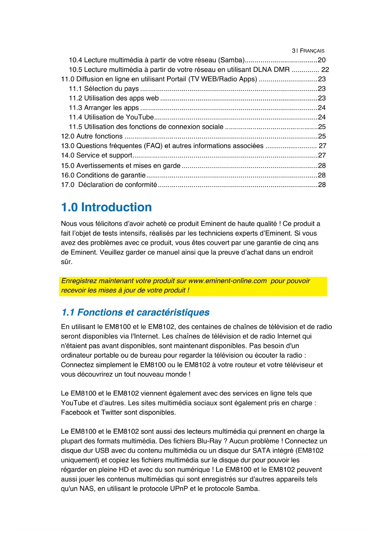 Nos you felicitons d'avoir acheté ce produit Eminent de haute qualite ! Ce produit a fait l'objet de tests intensifs, réalisés par les techniciens experts d'Eminent. Si vous avez des problèmes avec ce produit, vous etes couvert par une garantie de cinq ans de Eminent. Veuillez garder ce manuel ainsi que la preuve d'achat dans un endroit sur.
