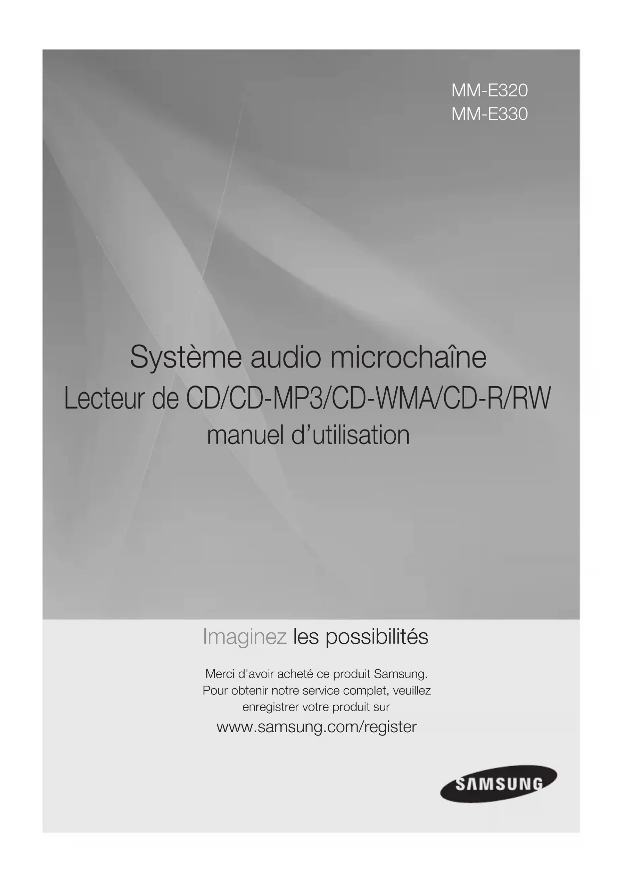 MM-E320 MM-E330 Système audio microchaîne Lecteur de CD/CD-MP3/CD-WMA/CD-R/RW manuel d’utilisation Imaginez les possibilités Merci d'avoir acheté ce produit Samsung.Pour obtenir notre service complet, veuillez enregistrer votre produit sur www.samsung.com/register AH68-02669-MM-E320_E330-FRA-0826-00.indd 1 2013-9-11 13:55:122 Français Français 3 Avertissements de sécurité POUR RÉDUIRE LES RISQUES D’ÉLECTROCUTION, NE RETIREZ JAMAIS LE CAPOT (NI L’ARRIÈRE).LES PIÈCES DE CE PRODUIT NE SONT PAS RÉPARABLES PAR L’UTILISATEUR. VEUILLEZ CONTACTER UN TECHNICIEN QUALIFIÉ POUR TOUTE RÉPARATION. ATTENTION RISQUE D’ÉLECTROCUTIONNE PAS OUVRIRCe symbole indique la présence d’une tension dangereuse dans l’appareil, présentant un risque d’électrocution ou de blessures.ATTENTION : AFIN D’ÉVITER TOUT RISQUE D’ÉLECTROCUTION, LA BROCHE LA PLUS LARGE DE LA FICHE DOIT ÊTRE TOTALEMENT INSÉRÉE DANS LE TROU PLUS LARGE.Ce symbole indique les directives importantes qui accompagnent le produit.AVERTISSEMENT ● Afin de réduire tout risque d’incendie ou d’électrocution, n’exposez jamais cet appareil à la pluie ou à l’humidité.ATTENTION ● Évitez toute projection d’eau sur l’appareil et ne posez jamais d’objet contenant un liquide dessus (ex : un vase). ● La fiche permet de débrancher l’appareil et doit toujours être facilement accessible. ● Cet appareil doit toujours être branché à une prise de courant alternatif reliée à la terre. ● Pour débrancher l’appareil, il convient de retirer la fiche de la prise murale, il faut donc que cette dernière soit facilement accessible.CLASS 1 LASER PRODUCTKLASSE 1 LASER PRODUKT LUOKAN 1 LASER LAITEKLASS 1 LASER APPARATPRODUCTO LÁSER CLASE 1