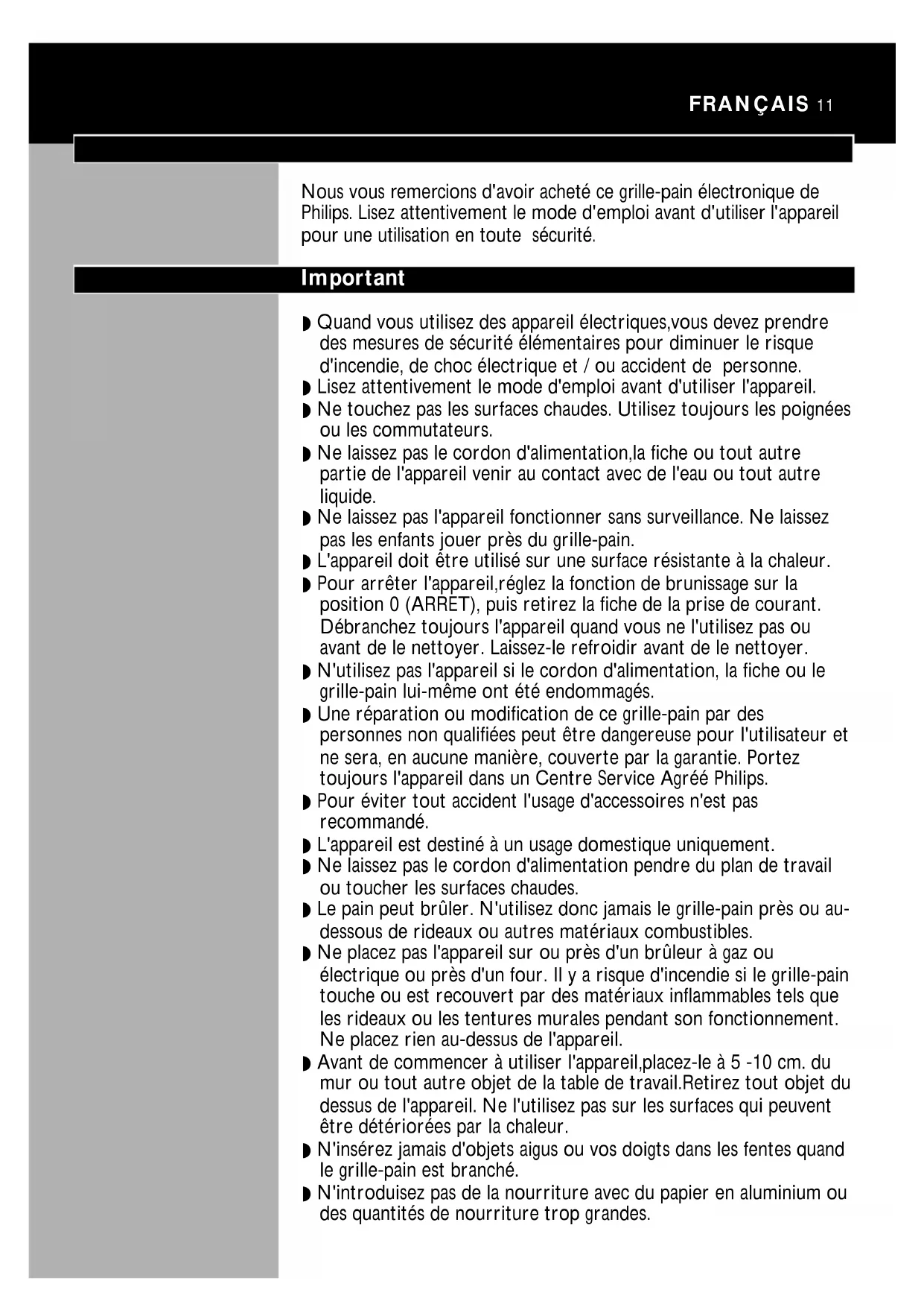 Nous vous remercions d'avoir acheté ce grille-pain électronique de Philips. Lisez attentivement le mode d'emploi avant d'utiliser l'appareil pour une utilisation en toute sécurité.