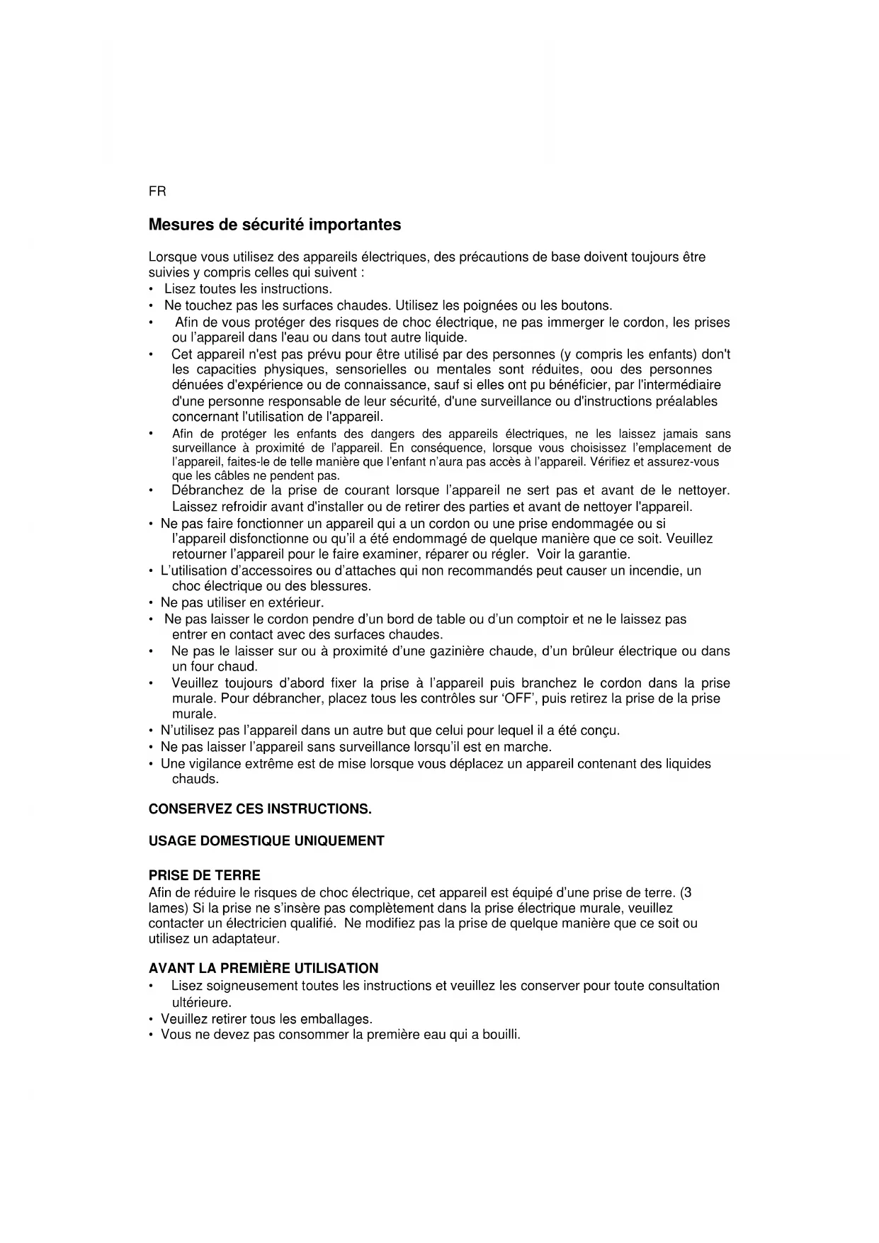 • Ne pas immerger la bouilloire ou le socle dans l’eau ou dans tout autre liquide.Un cordon d’alimentation court est fourni afin de réduire les risques qu’entraîneraient un cordon