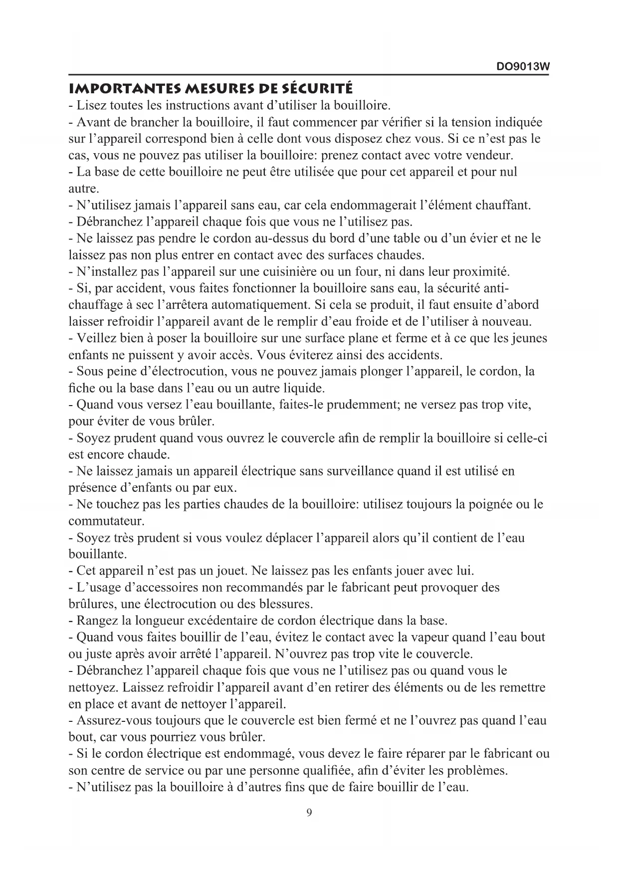 - Lisez toutes les instructions avant d’utiliser la bouilloire. - Avant de brancher la bouilloire, il faut commencer par vérier si la tension indiquée sur l’appareil correspond bien à celle dont vous disposez chez vous. Si ce n’est pas le cas, vous ne pouvez pas utiliser la bouilloire: prenez contact avec votre vendeur. - La base de cette bouilloire ne peut être utilisée que pour cet appareil et pour nul autre. - N’utilisez jamais l’appareil sans eau, car cela endommagerait l’élément chauffant. - Débranchez l’appareil chaque fois que vous ne l’utilisez pas. - Ne laissez pas pendre le cordon au-dessus du bord d’une table ou d’un évier et ne le laissez pas non plus entrer en contact avec des surfaces chaudes. - N’installez pas l’appareil sur une cuisinière ou un four, ni dans leur proximité. - Si, par accident, vous faites fonctionner la bouilloire sans eau, la sécurité anti- chauffage à sec l’arrêtera automatiquement. Si cela se produit, il faut ensuite d’abord laisser refroidir l’appareil avant de le remplir d’eau froide et de l’utiliser à nouveau. - Veillez bien à poser la bouilloire sur une surface plane et ferme et à ce que les jeunes enfants ne puissent y avoir accès. Vous éviterez ainsi des accidents. - Sous peine d’électrocution, vous ne pouvez jamais plonger l’appareil, le cordon, la che ou la base dans l’eau ou un autre liquide. - Quand vous versez l’eau bouillante, faites-le prudemment; ne versez pas trop vite, pour éviter de vous brûler. - Soyez prudent quand vous ouvrez le couvercle an de remplir la bouilloire si celle-ci est encore chaude. - Ne laissez jamais un appareil électrique sans surveillance quand il est utilisé en présence d’enfants ou par eux. - Ne touchez pas les parties chaudes de la bouilloire: utilisez toujours la poignée ou le commutateur. - Soyez très prudent si vous voulez déplacer l’appareil alors qu’il contient de l’eau bouillante. - Cet appareil n’est pas un jouet. Ne laissez pas les enfants jouer avec lui. - L’usage d’accessoires non recommandés par le fabricant peut provoquer des brûlures, une électrocution ou des blessures. - Rangez la longueur excédentaire de cordon électrique dans la base. - Quand vous faites bouillir de l’eau, évitez le contact avec la vapeur quand l’eau bout ou juste après avoir arrêté l’appareil. N’ouvrez pas trop vite le couvercle. - Débranchez l’appareil chaque fois que vous ne l’utilisez pas ou quand vous le nettoyez. Laissez refroidir l’appareil avant d’en retirer des éléments ou de les remettre en place et avant de nettoyer l’appareil. - Assurez-vous toujours que le couvercle est bien fermé et ne l’ouvrez pas quand l’eau bout, car vous pourriez vous brûler. - Si le cordon électrique est endommagé, vous devez le faire réparer par le fabricant ou son centre de service ou par une personne qualiée, an d’éviter les problèmes. - N’utilisez pas la bouilloire à d’autres ns que de faire bouillir de l’eau. 9DO9013W - L’appareil ne peut être utilisé qu’avec la base fournie. - Quand la bouilloire est trop pleine, l’eau peut déborder. - L’appareil n’est destiné qu’à un usage domestique et il ne peut pas être utilisé à l’extérieur. - Conservez ces instructions.