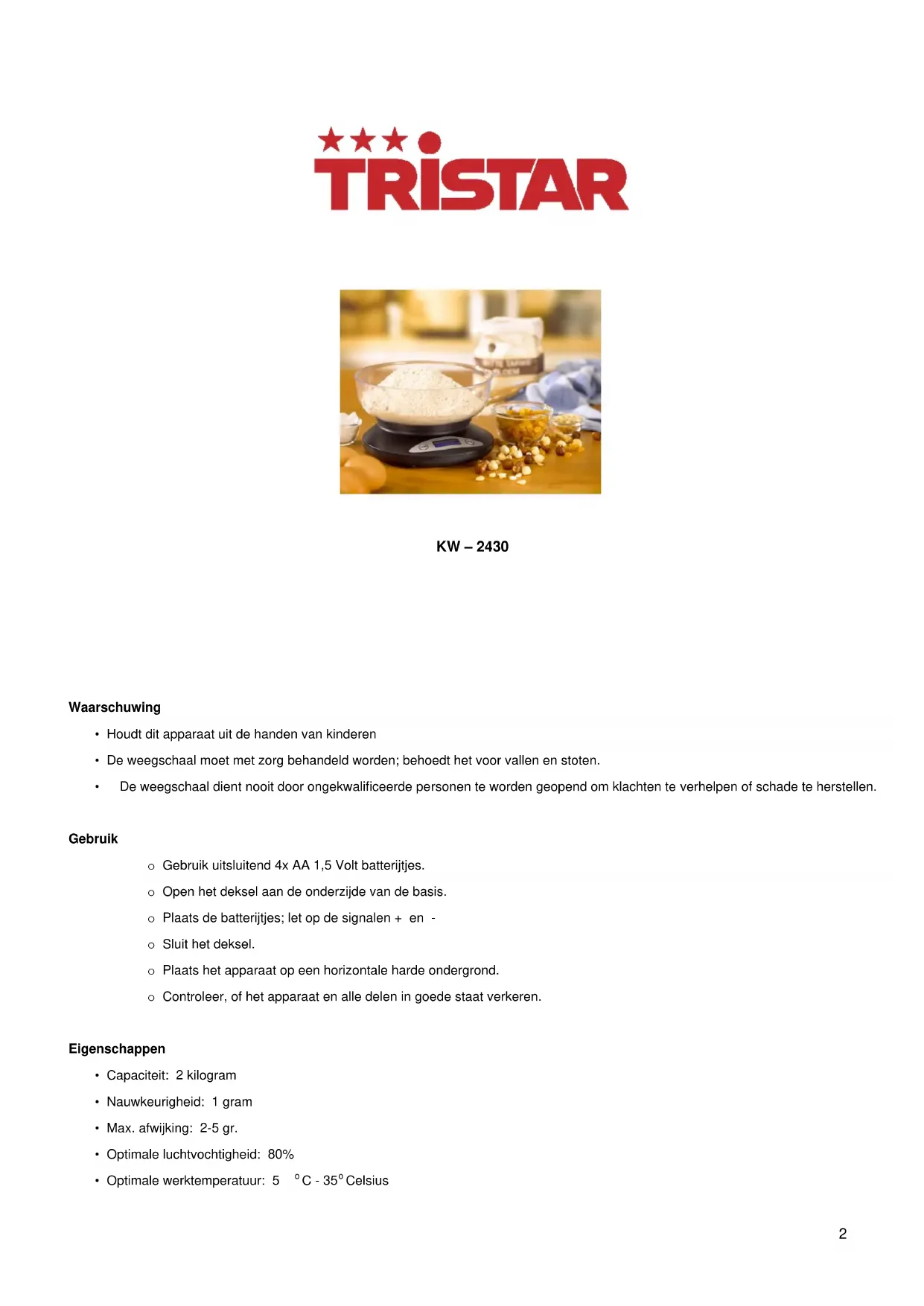 Retrouvez gratuitement la notice de l'appareil Kitchen scale TRISTAR au format PDF.