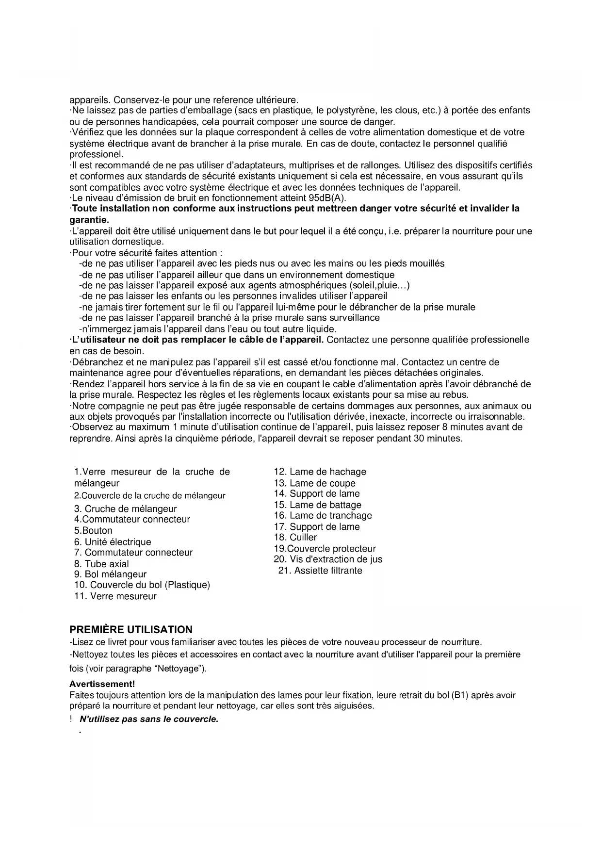 -Lisez ce livret pour vous familiariser avec toutes les pièces de votre nouveau processeur de nourriture. -Nettoyez toutes les pièces et accessoires en contact avec la nourriture avant d'utiliser l'appareil pour la première fois (voir paragraphe “Nettoyage”). Avertissement! Faites toujours attention lors de la manipulation des lames pour leur fixation, leure retrait du bol (B1) après avoir préparé la nourriture et pendant leur nettoyage, car elles sont très aiguisées. ! N'utilisez pas sans le couvercle. .COMMENT UTILISER Votre nouveau processeur de nourriture vous aidera à préparer de nombreux mélanges de base que vous pouvez utiliser dans vos recettes. Veuillez respecter les instructions suivantes pour obtenir les meilleurs résultats et conserver votre appareil en bonne condition de fonctionnement. Attention! Ne dépassez jamais les quantités maximum ci-dessous et ne versez jamais de liquide avec une température supérieure à 75℃ dans le bol et/ou mélangeur. Suivez les instructions données ci-dessous pour chaque utilisation : -Ne laissez jamais l'appareil sans surveilleance lorsqu'il est sous tension. -Ne faites jamais fonctionner l'appareil à vide. -Ne touchez jamais les parties mobiles. -Ne mettez jamais vos doigts ou des ustensiles par l'ouverture du couvercle. -N'appuyez jamais sur les ingrédients par l'ouverture du couvercle avec vos mains. -N'utilisez pas l'appareil pour des ingrédients durs (e.g, viande congelée, croutes de fromage…), caoutchouteux (e.g. peau glacée…), parties inmangeables des ingrédients (e.g. os, arrètes…) ou piller la glace. -Ne retirez pas le couvercle et ne remplacez jamais les accessoires sans mettre hors tension l'appareil et si les accessoires n'ont pas fini de fonctionner. -Ne retirez pas les ingrédients du bol avant d'avoir retiré la lame. A: Bol mélangeur