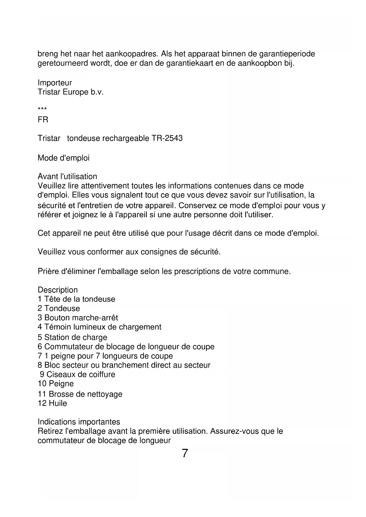 Tristar tondeuse rechargeable TR-2543 Mode d'emploi Avant l'utilisation Veuillez lire attentivement toutes les informations contenues dans ce mode d'emploi. Elles vous signalent tout ce que vous devez savoir sur l'utilisation, la sécurité et l'entretien de votre appareil. Conservez ce mode d'emploi pour vous y référer et joignez le à l'appareil si une autre personne doit l'utiliser. Cet appareil ne peut être utilisé que pour l'usage décrit dans ce mode d'emploi. Veuillez vous conformer aux consignes de sécurité. Prière d'éliminer l'emballage selon les prescriptions de votre commune. Description 1 Tête de la tondeuse 2 Tondeuse 3 Bouton marche-arrêt 4 Témoin lumineux de chargement 5 Station de charge 6 Commutateur de blocage de longueur de coupe 7 1 peigne pour 7 longueurs de coupe 8 Bloc secteur ou branchement direct au secteur 9 Ciseaux de coiffure 10 Peigne 11 Brosse de nettoyage 12 Huile Indications importantes Retirez l'emballage avant la première utilisation. Assurez-vous que le commutateur de blocage de longueur8 de coupe (6) est placé sur Unlock', :Le peigne amovible ne peut être inséré que lorsque le commutateur est dans cette position. L'appareil a été soigneusement contrôlé avant l’envoi pour garantir que les lames sont bien huilées. Chargement de l'accumulateur Assurez-vous que la tondeuse est désactivée, c.-à-d. que le commutateur On/ Off (3) doit être positionné sur ''Off". Placez la tondeuse sur la station de charge (5). Branchez le bloc secteur (8) au secteur et raccordez celui-ci à la station de charge. L'accumulateur commence maintenant à se charger et le témoin lumineux de chargement (4) s'allume. Après une durée de chargement de 4 heures, la tondeuse est opérationnelle, sans câble, pour env. 30 - 40 minutes. Retirez la tondeuse de la station de charge et placez le commutateur OnlOff sur "ON". Désactivez de nouveau l'appareil après usage. Vous pouvez également charger l'accumulateur sans station de charge. Assurez-- vous que l'appareil est désactivé. Branchez le bloc secteur (8) au secteur et raccordez celui-ci directement à la tondeuse. L'accumulateur commence maintenant à se charger et le témoin lumineux de chargement (4) s'allume. Après une durée de chargement de 4 heures, la tondeuse est opérationnelle, sans câble pour env, 30 - 40 minutes également. Retirez la fiche de la tondeuse et placez tout simplement le commutateur On/Off sur "ON". Désactivez de nouveau l'appareil après usage. Utilisation avec le secteur Assurez-vous que l'appareil est désactivé, c.-à-d. que le commutateur On/Off (3) doit être positionné sur "Off'. Branchez le bloc secteur (8) au secteur et raccordez celui-ci directement à la tondeuse. Si vous mettez maintenant l'appareil en marche, vous pourrez immédiatement commencer à couper. Désactivez de nouveau l'appareil après usage. Cette possibilité vous permet, lors du déchargement inattendu de l'accumulateur, de passer immédiatement au fonctionnement sur secteur, et de poursuivre le travail. Utilisation du peigne amovible Maintenez la tondeuse dans le sens inverse. Veillez à ce que le commutateur de blocage de longueur de coupe (6), sur la partie inférieure de la tondeuse, soit sur la position "Unlock". Insérez maintenant les deux rails de guidage du peigne9 amovible dans les glissières au niveau du boîtier. Le peigne amovible peut être réglé sur 7 longueurs de coupe différentes. La longueur réglée est indiquée en mm au niveau du peigne amovible (de 4 à 20 mm). 1 . Réglez la longueur souhaitée en plaçant d'abord le commutateur de blocage de longueur de coupe (6), sur la partie arrière de l'appareil, sur ''Unlock". Placez votre pouce sur la surface nervurée du peigne amovible et glissez ce dernier en avant ou en arrière jusqu'à ce que la longueur de coupe que vous souhaitez soit réglée. Exemple : Sur la tondeuse, si la petite flèche pointe sur l'indication 20 mm, c'est qu'une longueur de coupe de 20 mm est réglée, etc.