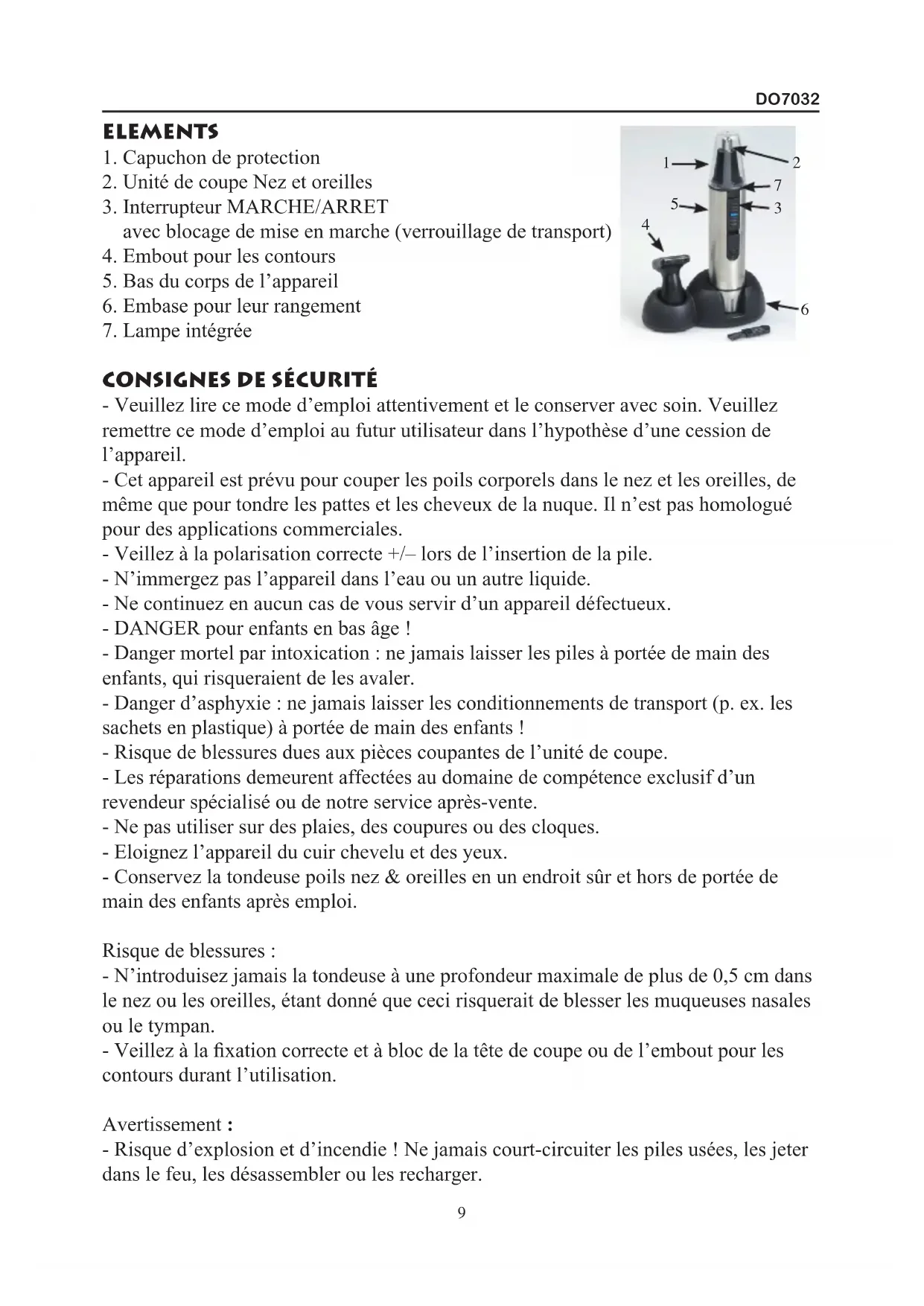 6DO7032 - Risque de brûlure due à l’acide des piles en cas de contact avec la peau, les yeux et les muqueuses. Rincer les endroits concernés immédiatement et abondamment à l’eau claire et consulter immédiatement un médecin. - Ne pas utiliser si l’appareil ou les pièces coupantes sont endommagées ou défectueuses. - L’emploi de cet appareil est interdit aux personnes (y compris les enfants) souffrant de capacités physiques, sensorielles ou mentales restreintes ou ne pouvant pas s’en servir pour cause d’un manque d’expériences et /ou de connaissances, sauf si elles sont surveillées par une personne compétente en matière de sécurité ou si ladite personne leur a donné des instructions spéciques à l’emploi de l’appareil. UTILISATION Veillez toujours à l’état impeccable de l’appareil avant de vous en servir. L’utilisation de la tondeuse poils nez & oreilles doit uniquement se faire avec une pile alcaline de 1,5 Volts, type LR6. INSERTION DE LA PILE : Maintenir la tondeuse avec l’unité de coupe vers le bas pour l’insertion ou le remplacement de la pile. Ensuite, vous pouvez retirer le bas du corps de l’appareil par une rotation contre le sens des aiguilles de la montre. Insérez la pile jointe. Assurez-vous d’avoir retiré la pellicule de protection de la pile au préalable. Apportez une attention particulière à la polarité (+/–) dans ce contexte. Remettez le bas du corps de l’appareil en place et tournez-le dans le sens des aiguilles de la montre jusqu’à la butée. Servez-vous toujours d’un miroir durant l’utilisation de l’appareil. Nettoyez la tondeuse après emploi en suivant les descriptions données au chapitre du nettoyage. MISE EN CIRCUIT ET HORS CIRCUIT DE LA TONDEUSE : Retirez le capuchon de protection avant de vous servir de l’appareil, appuyez ensuite sur la protection de mise en marche et poussez l’interrupteur Marche/Arrêt vers le haut ou le bas pour mettre l’appareil en circuit ou hors circuit après emploi. UTILISATION DE LA TÊTE DE COUPE : Retirez le capuchon de protection de la tête decoupe appuyez sur la protection de mise en marche et poussez simultanément l’interrupteur Marche/Arrêt vers le haut. La lame tourne et vous pouvez commencer la tonte des poils dans la zone du nez et des oreilles. La lampe intégrée s’avère très utile dans ce contexte. UTILISATION DE L’EMBOUT POUR LES CONTOURS : Mettre l’appareil hors circuit. Retirez la tête de coupe de la tondeuse nez & oreilles du corps de l’appareil au moyen d’une rotation contre le sens des aiguilles de la montre (rotation vers la gauche). L’emboîtement de l’embout pour les contours s’effectue au moyen d’une rotation dans le sens des aiguilles de la montre (rotation vers la droite) 10DO7032 en faisant simultanément pression sur le corps de l’appareil. Faites glisser l’embout pour les contours à angle plat et sans pression du haut vers le bas le long de la peau. Ne poussez pas l’appareil de bas en haut et ne le déplacez pas latéralement. Ceci pourrait mener à des blessures par coupures. Attention : Veillez à ce que le capot du compartiment de la pile / le bas du corps de l’appareil soit correctement fermé avant de nettoyer l’appareil. N’immergez pas l’appareil dans l’eau ou un autre liquide.