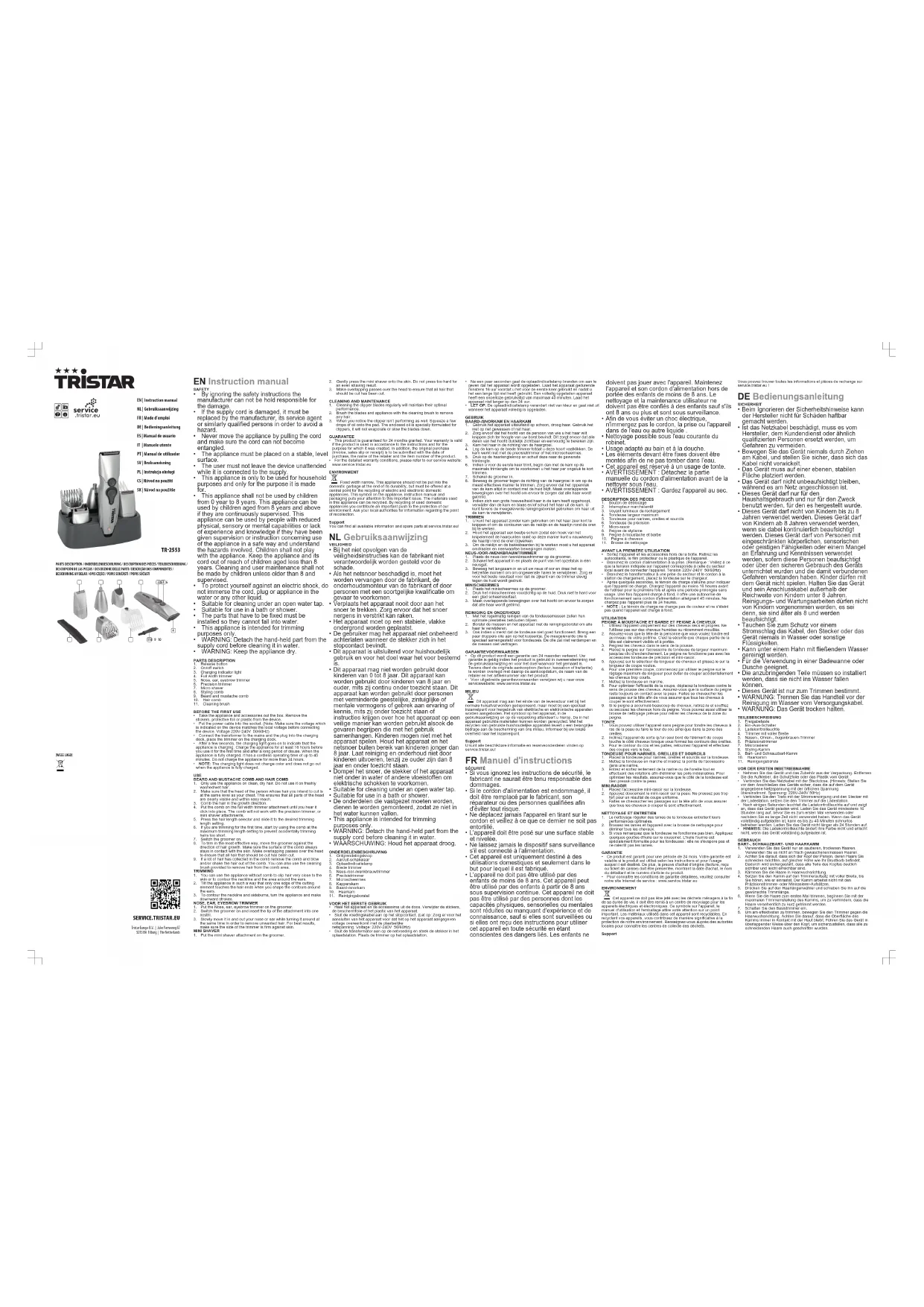 - AVERTISSEMENT:Gardezl’appareilausec. DESCRIPTIONDESPIÈCES1. Boutondedéblocage2. Interrupteurmarche/arrêt3. Voyantlumineuxderechargement4. Tondeuselargeurmaximum5. Tondeusepournarines,oreillesetsourcils6. Tondeusedeprécision7. Microrasoir8. Peignedestylisme9. Peigneàmoustacheetbarbe10. Peigneàcheveux11. BrossedenettoyageAVANTLAPREMIÈREUTILISATION• Sortezl'appareiletlesaccessoireshorsdelaboîte.Retirezlesautocollants,lefilmprotecteurouleplastiquedel'appareil.• Branchezlecordond’alimentationàlaprise.(Remarque:Veillezàcequelatensionindiquéesurl’appareilcorrespondeàcelledusecteurlocalavantdeconnecterl'appareil.Tension220V240V50/60Hz)• Branchezletransformateuràuneprisedusecteuretlecordonàlastationdechargement,placezlatondeusesurlechargeur.• Aprèsquelquessecondes,letémoindecharges'allumepourindiquerquel'appareilsecharge.Chargezl'appareilaumoins16heuresavantdel'utiliserpourlapremièrefoisetaprèsunepériodeprolongéesansusage.Unefoisl'appareilchargéàfond,iloffreuneautonomiedefonctionnementsanscordond'alimentationatteignant45minutes.Nechargezpasl'appareilplusde24heures.• NOTE:Letémoindechargenechangepasdecouleuretnes'éteintpasquandl'appareilestchargéàfond.UTILISATIONPEIGNEÀMOUSTACHEETBARBEETPEIGNEÀCHEVEUX1. Utilisezl'appareiluniquementsurdescheveuxsecsetpropres.Nel'utilisezpassurdescheveuxhumidesourécemmentmouillés.2. Assurezvousquelatêtedelapersonnequevousvouleztondreestauniveaudevotrepoitrine.C'estlasécuritéquechaquepartiedelatêteestclairementvisibleetàportée.3. Peignezlescheveuxdanslesensdelapousse.4. Placezlepeignesurl'accessoiredetondeusedelargeurmaximumjusqu'auclicd'enclenchement.Lepeignenefonctionnepasaveclesaccessoirestondeusedeprécisionetminirasoir.5. Appuyezsurlesélecteurdelongueurdecheveuxetglissezlesurlalongueurdecoupevoulue.6. Pourunepremièrecoupe,commencezparutiliserlepeignesurleréglagemaximumdelongueurpouréviterdecouperaccidentellementlescheveuxtropcourts.7. Mettezlatondeuseenmarche.8. Pouroptimiserl'efficacitédelacoupe,déplacezlatondeusecontrelesensdepoussedescheveux.Assurezvousquelasurfacedupeignerestetoujoursencontactaveclapeau.Faitessechevaucherlespassagessurlatêteafindevousassurerquetouslescheveuxàcouperlesonteffectivement.9. Silepeigneaaccumulébeaucoupdecheveux,retirezleetsoufflezousecouezlescheveuxhorsdupeigne.Vouspouvezaussiutiliserlabrossedenettoyageprévuepourretirerlescheveuxdelazonedupeigne.TONTE1. Vouspouvezutiliserl'appareilsanspeignepourtondrelescheveuxàrasdelapeauoufaireletourducouainsiquedanslazonedesoreilles.2. Inclinezl'appareildesortequ'unseulborddel'élémentdecoupetouchelecôtécheveuxlorsquevousformezlescontoursdesoreilles.3. Pourlecontourducouetlespattes,retournezl'appareileteffectuezdescoupesverslebas.TONDEUSEPOURNARINES,OREILLESETSOURCILS1. Placezlatondeusepournarines,oreillesetsourcilssurlatondeuse.2. Mettezlatondeuseenmarcheetinsérezlapointedel'accessoiredansunenarine.3. Entrezetsortezlentementdelanarineoudel'oreilletouteneffectuantdesrotationsafind'éliminerlespoilsindésirables.Pouroptimiserlesrésultats,assurezvousquelecôtédelatondeuseestbienpressécontrelapeau.MINIRASOIR1. Placezl'accessoireminirasoirsurlatondeuse.2. Appuyezdoucementleminirasoirsurlapeau.Nepressezpastropfortpourunrésultatdecoupeuniforme.3. Faitessechevaucherlespassagessurlatêteafindevousassurerquetouslescheveuxàcouperlesonteffectivement.NETTOYAGEETENTRETIEN1. Lenettoyagerégulierdeslamesdelatondeuseentretientleursperformancesoptimales.2. Brossezleslamesetl'appareilaveclabrossedenettoyagepouréliminertouslescheveux.3. Sivousremarquezquelatondeusenefonctionnepasbien.Appliquezquelquesgouttesd'huilesurlecoussinet.L'huilefournieestspécialementformuléepourlestondeuses:ellenes'évaporepasetneralentitpasleslames.GARANTIE• Ceproduitestgarantipourunepériodede24mois.Votregarantieestvalablesileproduitestutiliséselonlesinstructionsetpourl'usageauquelilestdestiné.Deplus,lapreuved'achatd'origine(facture,reçuouticketdecaisse)doitêtreprésentée,montrantladated'achat,lenomdudétaillantetlenumérod'articleduproduit.• Pourconnaîtrelesconditionsdegarantiedétaillées,veuillezconsulternotresiteInternetdeservice:www.service.tristar.euENVIRONNEMENTCetappareilnedoitpasêtrejetéaveclesdéchetsménagersàlafindesaduréedevie,ildoitêtreremisàuncentrederecyclagepourlesappareilsélectriquesetélectroniques.Cesymbolesurl'appareil,lemanueld'utilisationetl'emballageattirevotreattentionsurunpointimportant.Lesmatériauxutilisésdanscetappareilsontrecyclables.Enrecyclantvosappareils,vouscontribuezdemanièresignificativeàlaprotectiondenotreenvironnement.Renseignezvousauprèsdesautoritéslocalespourconnaîtrelescentresdecollectedesdéchets.SupportVouspouveztrouvertouteslesinformationsetpiècesderechangesurservice.tristar.eu! DEBedienungsanleitung SICHERHEIT