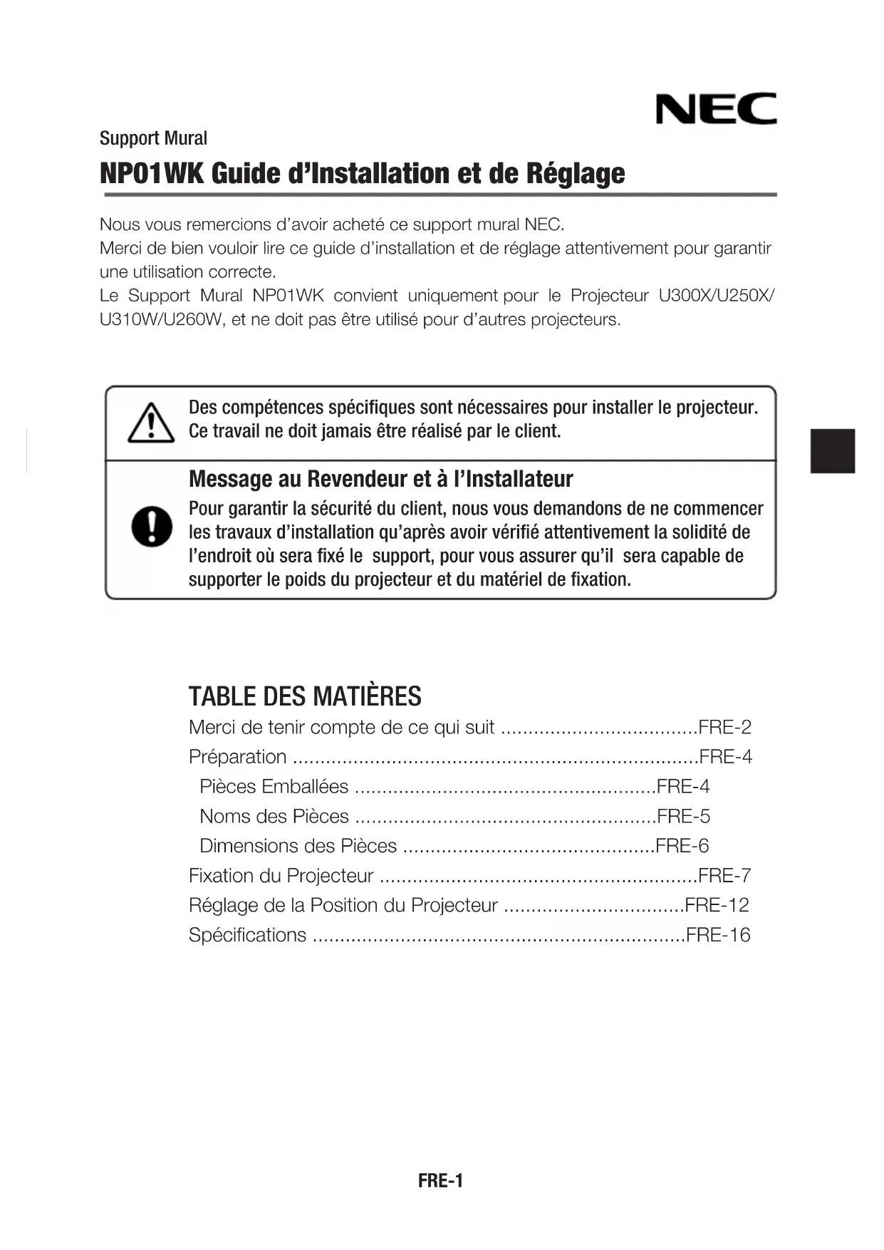 - Die technischen Daten und die Ausführung können ohne vorherige Ankündigung geändert werden.FRE-1 Support Mural NP01WK Guide d’Installation et de Réglage Nousvousremercionsd’avoirachetécesupportmuralNEC. Mercidebienvouloirlireceguided’installationetderéglageattentivementpourgarantir une utilisation correcte. Le Support Mural NP01WK convient uniquement pour le Projecteur U300X/U250X/ U310W/U260W,etnedoitpasêtreutilisépourd’autresprojecteurs. Des compétences spécifiques sont nécessaires pour installer le projecteur. Ce travail ne doit jamais être réalisé par le client. Message au Revendeur et à l’Installateur Pour garantir la sécurité du client, nous vous demandons de ne commencer les travaux d’installation qu’après avoir vérifié attentivement la solidité de l’endroit où sera fixé le support, pour vous assurer qu’il sera capable de supporter le poids du projecteur et du matériel de fixation.
