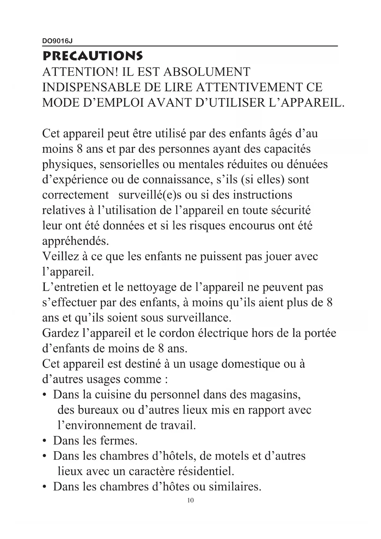 - Dans les chambres d’hôtes ou similaires. 10DO9016J Attention: l’appareil ne peut pas être utilisé avec une minuterie externe ou une commande à distance séparée. CONSIGNES DE SÉCURITÉ. Quand vous utilisez des appareils électriques, il est indispensable de respecter les consignes de sécurité.