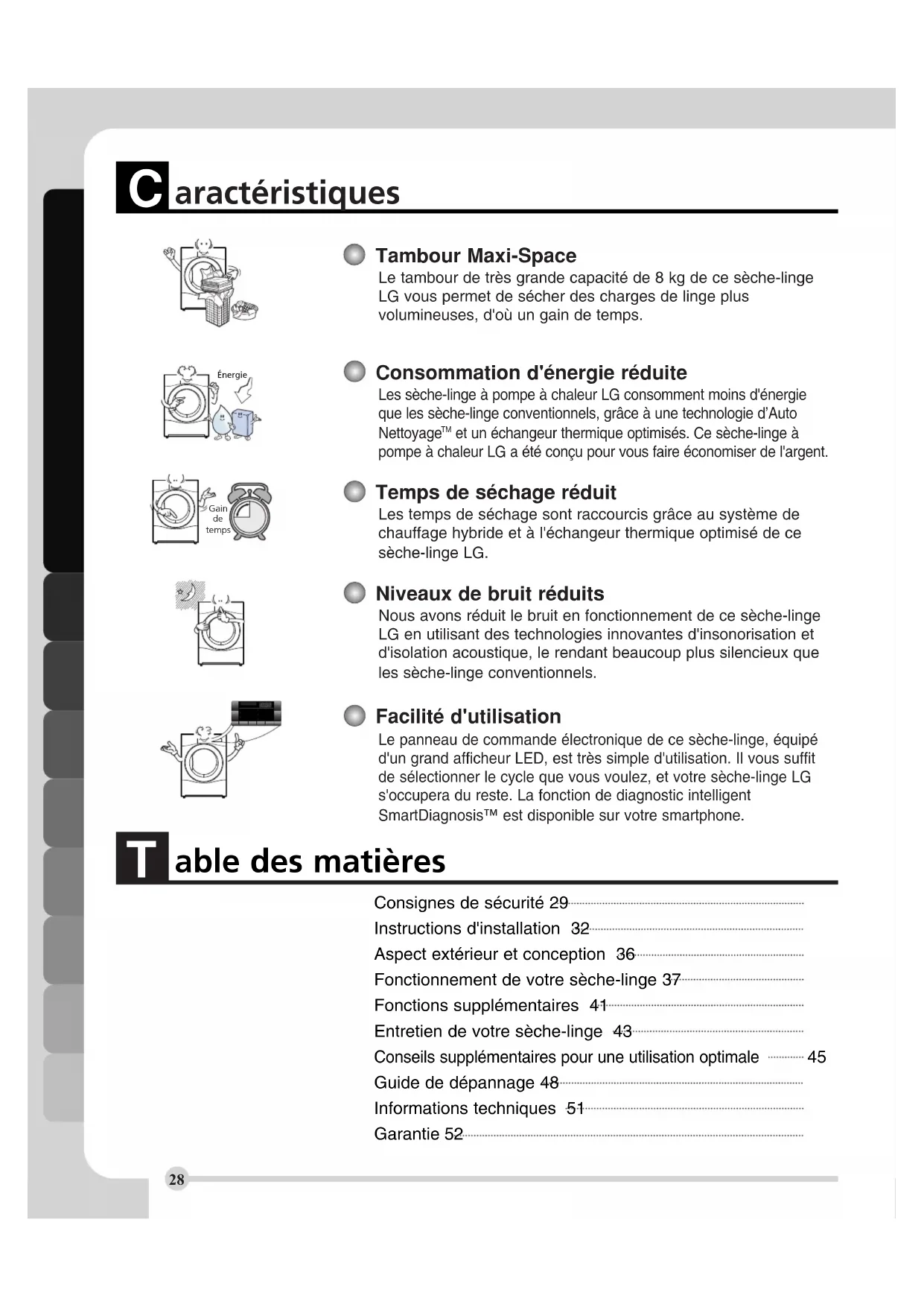 able des matières Consignes de sécurité 29 Instructions d'installation 32 Aspect extérieur et conception 36 Fonctionnement de votre sèche-linge 37 Fonctions supplémentaires 41 Entretien de votre sèche-linge 43 Conseils supplémentaires pour une utilisation optimale