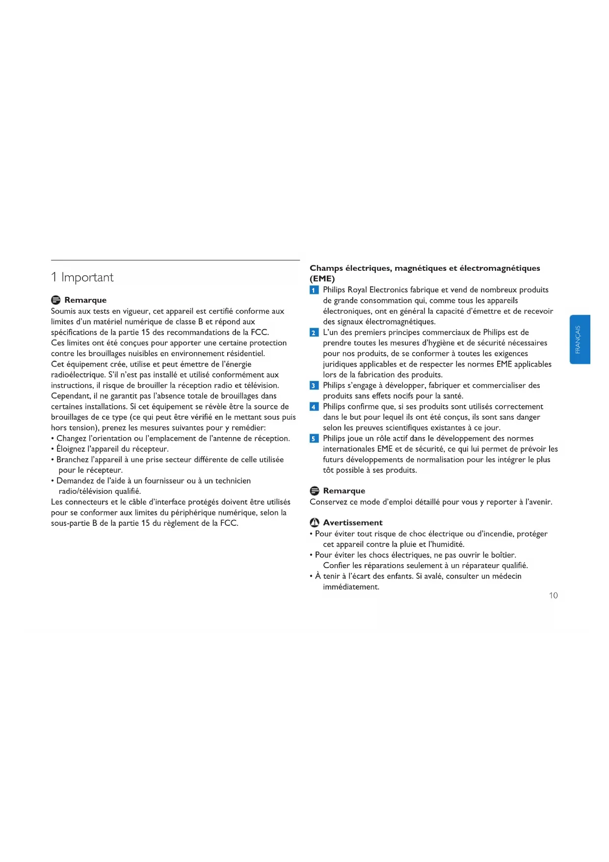 - Demandez de l’aide à un fournisseur ou à un technicien radio/télévision qualifié. Les connecteurs et le câble d’interface protégés doivent être utilisés pour se conformer aux limites du périphérique numérique, selon la sous-partie B de la partie 15 du règlement de la FCC. Champs électriques, magnétiques et électromagnétiques (EME) Philips Royal Electronics fabrique et vend de nombreux produits de grande consommation qui, comme tous les appareils électroniques, ont en général la capacité d’émettre et de recevoir des signaux électromagnétiques. L’un des premiers principes commerciaux de Philips est de prendre toutes les mesures d’hygiène et de sécurité nécessaires pour nos produits, de se conformer à toutes les exigences juridiques applicables et de respecter les normes EME applicables lors de la fabrication des produits. Philips s’engage à développer, fabriquer et commercialiser des produits sans effets nocifs pour la santé. Philips confirme que, si ses produits sont utilisés correctement dans le but pour lequel ils ont été conçus, ils sont sans danger selon les preuves scientifiques existantes à ce jour. Philips joue un rôle actif dans le développement des normes internationales EME et de sécurité, ce qui lui permet de prévoir les futurs développements de normalisation pour les intégrer le plus tôt possible à ses produits. Remarque Conservez ce mode d’emploi détaillé pour vous y reporter à l’avenir. Avertissement