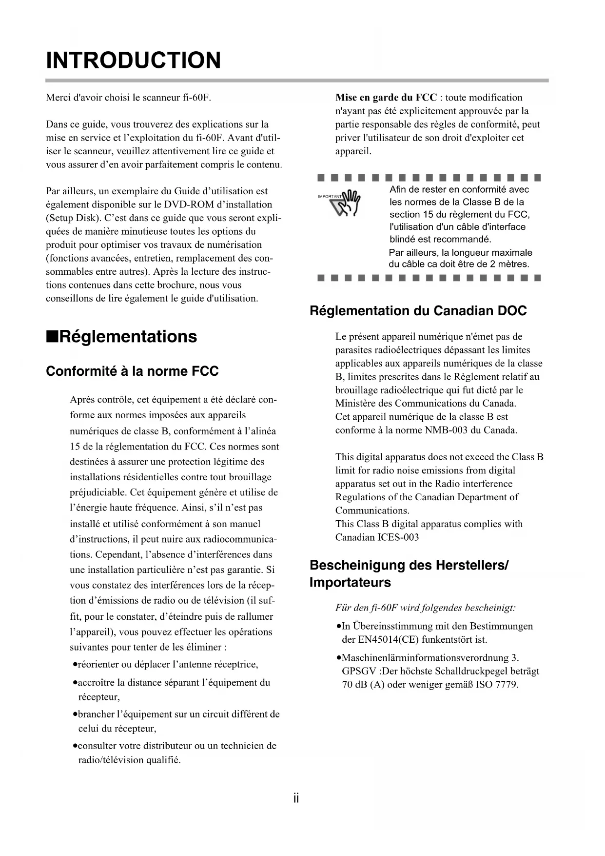 IMPORTANT Afin de rester en conformité avec les normes de la Classe B de la section 15 du règlement du FCC, l'utilisation d'un câble d'interface blindé est recommandé. Par ailleurs, la longueur maximale du câble ca doit être de 2 mètres.iii