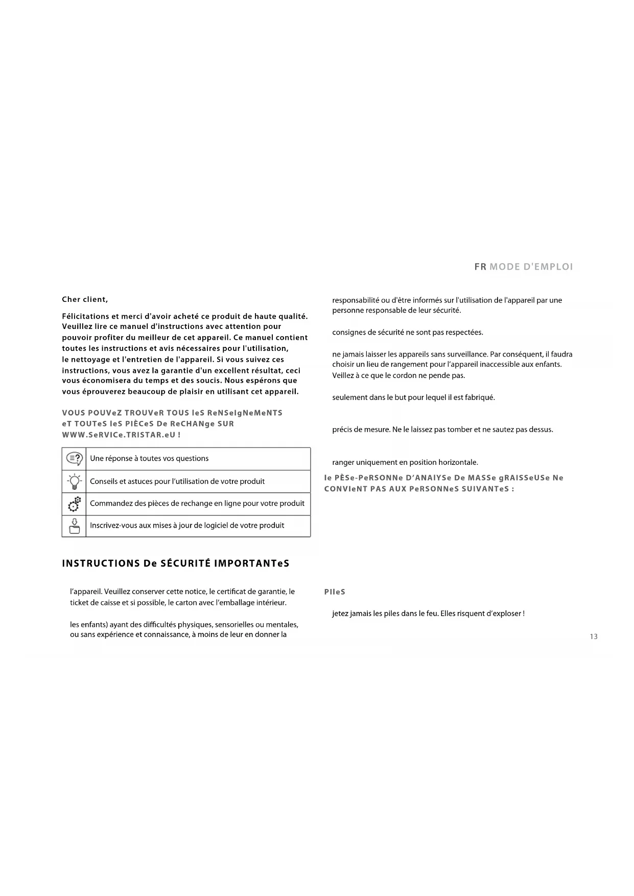 •Tristar ne sera pas responsable des dégâts matériels ou des blessures