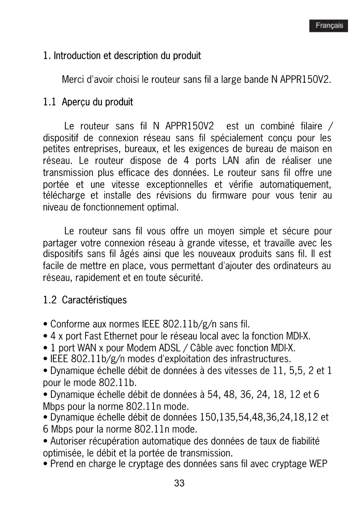 | Taux de transfert 11/54/150 Mbps | |