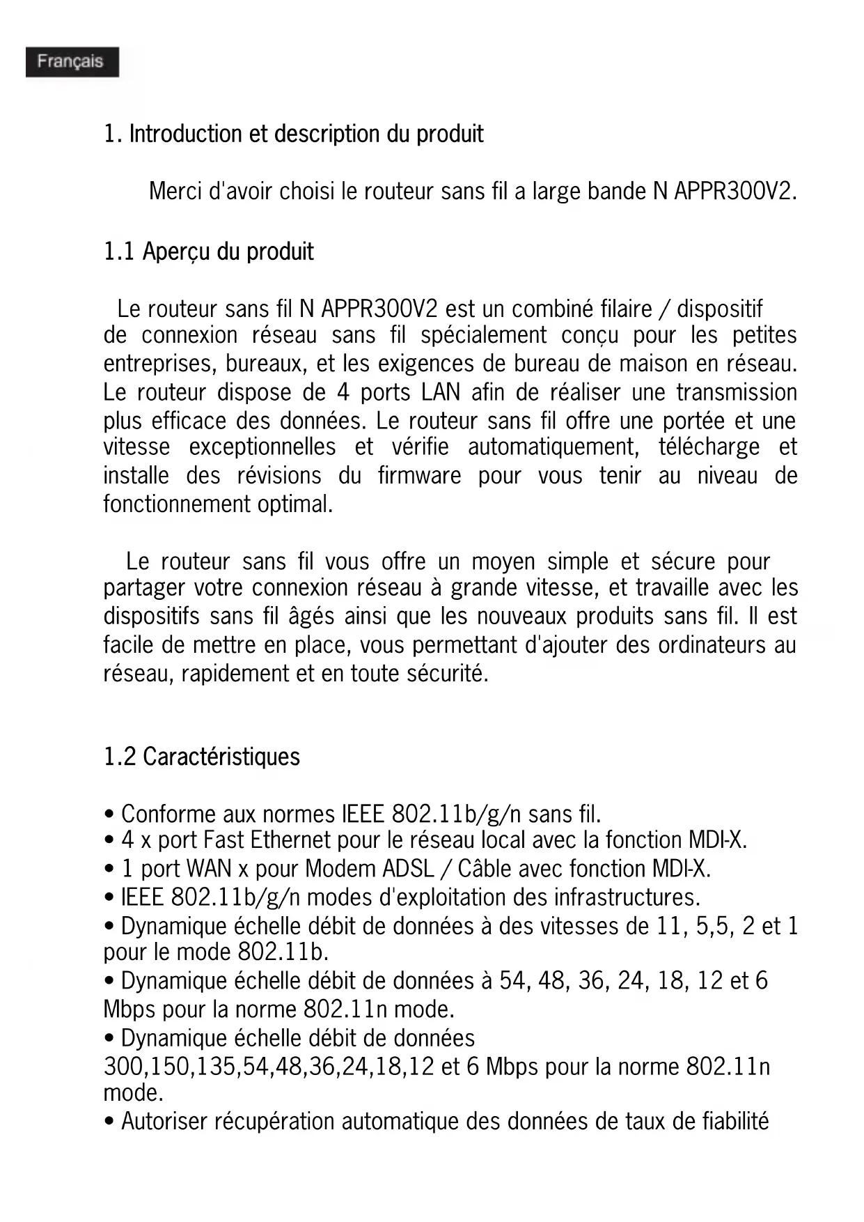 Ć Conforme aux normes IEEE 802.11b/g/n sans fil. Ć 4 x port Fast Ethernet pour le réseau local avec la fonction MDI-X. Ć 1 port WAN x pour Modem ADSL / Câble avec fonction MDI-X. Ć IEEE 802.11b/g/n modes d'exploitation des infrastructures. Ć Dynamique échelle débit de données à des vitesses de 11, 5,5, 2 et 1 pour le mode 802.11b. Ć Dynamique échelle débit de données à 54, 48, 36, 24, 18, 12 et 6 Mbps pour la norme 802.11n mode. Ć Dynamique échelle débit de données 300,150,135,54,48,36,24,18,12 et 6 Mbps pour la norme 802.11n mode. Ć Autoriser récupération automatique des données de taux de fiabilitéoptimisée, le débit et la portée de transmission. Ć Prend en charge le cryptage des données sans fil avec cryptage WEP 64/128 bits standard de sécurité. Ć Prise en charge pour améliorer la sécurité WPA-PSK, WPA2-PSK, WPA et WPA2. Ć des outils de configuration basés sur le Web et la gestion via un navigateur WEB. Ć Supporte PPPoE/PPTP/L2TP protocole pour l'ADSL. Ć Supporte NAT pour partager 1 adresse IP à tous les utilisateurs LAN. Ć Supporte serveur / client DHCP. Ć Protection pare-feu Supports, mappage de serveur virtuel, mise en application particulière. Ć Supporte UPnP. Ć Supporte des informations statistiques.