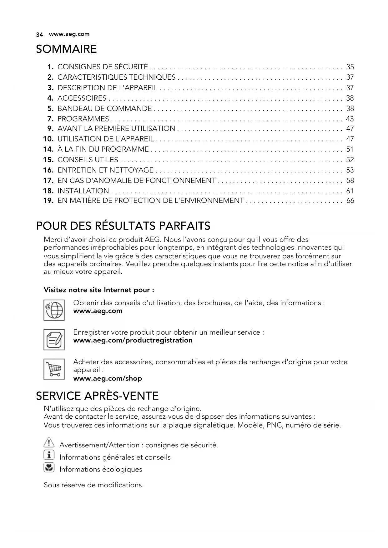 POUR DES RÉSULTATS PARFAITS Merci d'avoir choisi ce produit AEG. Nous l'avons conçu pour qu'il vous offre des