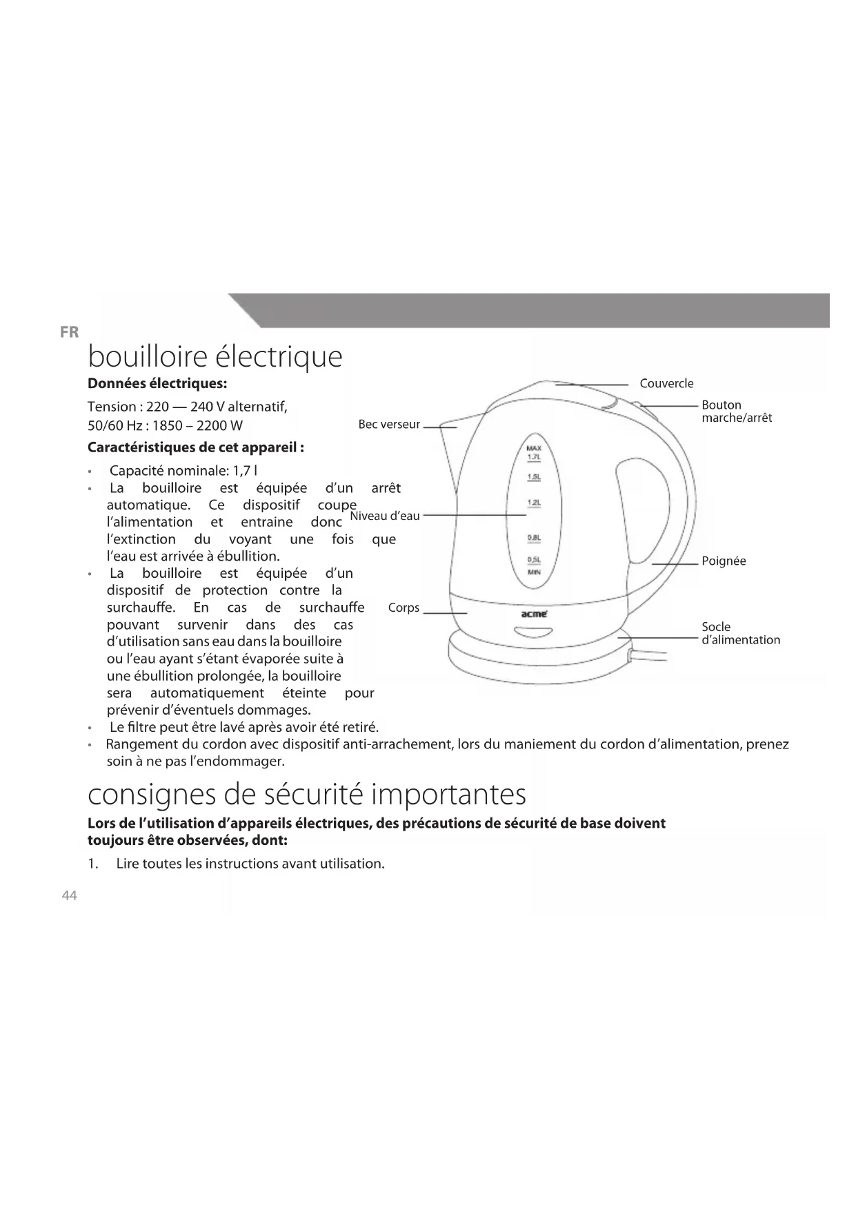 - Afin de prévenir les évventuels chocs électriques, ne pas immerger le cordon, la base de la bouilloire et bouilloire elle-même dans de l'eau ou tout autre liquide.