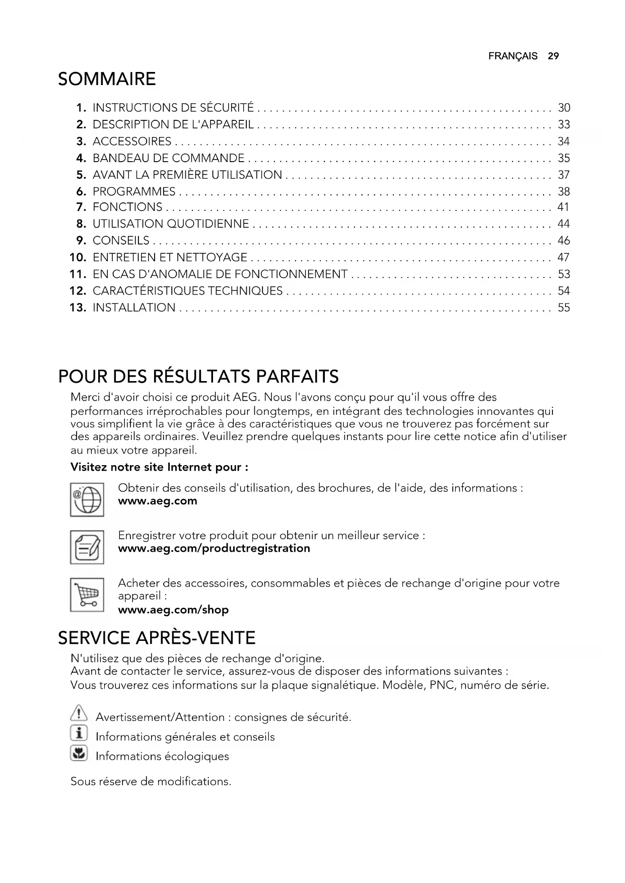 Merci d'avoir choisi ce produit AEG. Nous l'avons conçu pour qu'il vous offre des performances irréprochables pour longtemps, en intégrant des technologies innovantes qui vous simplifient la vie grâce à des caractéristiques que vous ne trouverez pas forcément sur des appareils ordinaires. Veuillez prendre quelques instants pour lire cette notice afin d'utiliser au mieux votre appareil. Visitez notre site Internet pour : Obtenir des conseils d'utilisation, des brochures, de l'aide, des informations : www.aeg.com Enregistrer votre produit pour obtenir un meilleur service : www.aeg.com/productregistration Acheter des accessoires, consommables et pièces de rechange d'origine pour votre appareil : www.aeg.com/shop