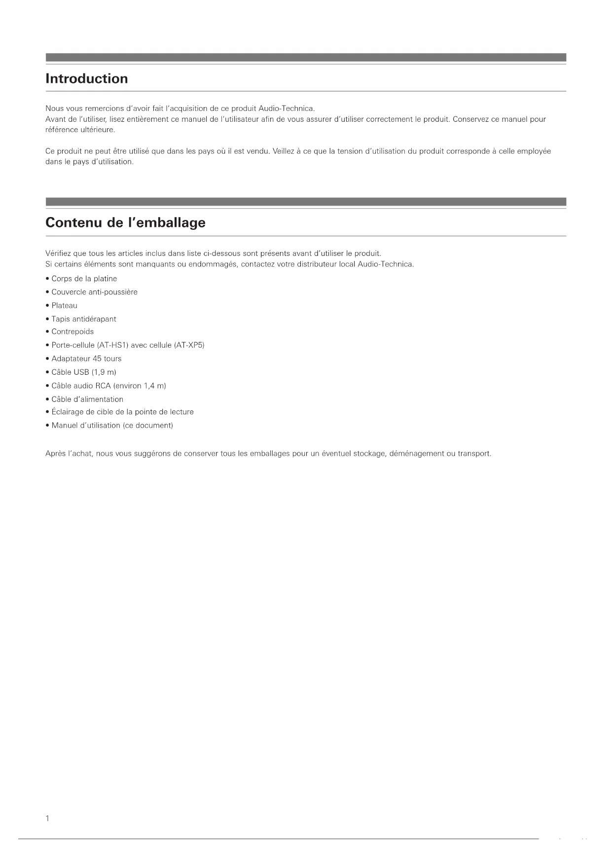 - Manuel d’utilisation (ce document) Après l’achat, nous vous suggérons de conserver tous les emballages pour un éventuel stockage, déménagement ou transport.2